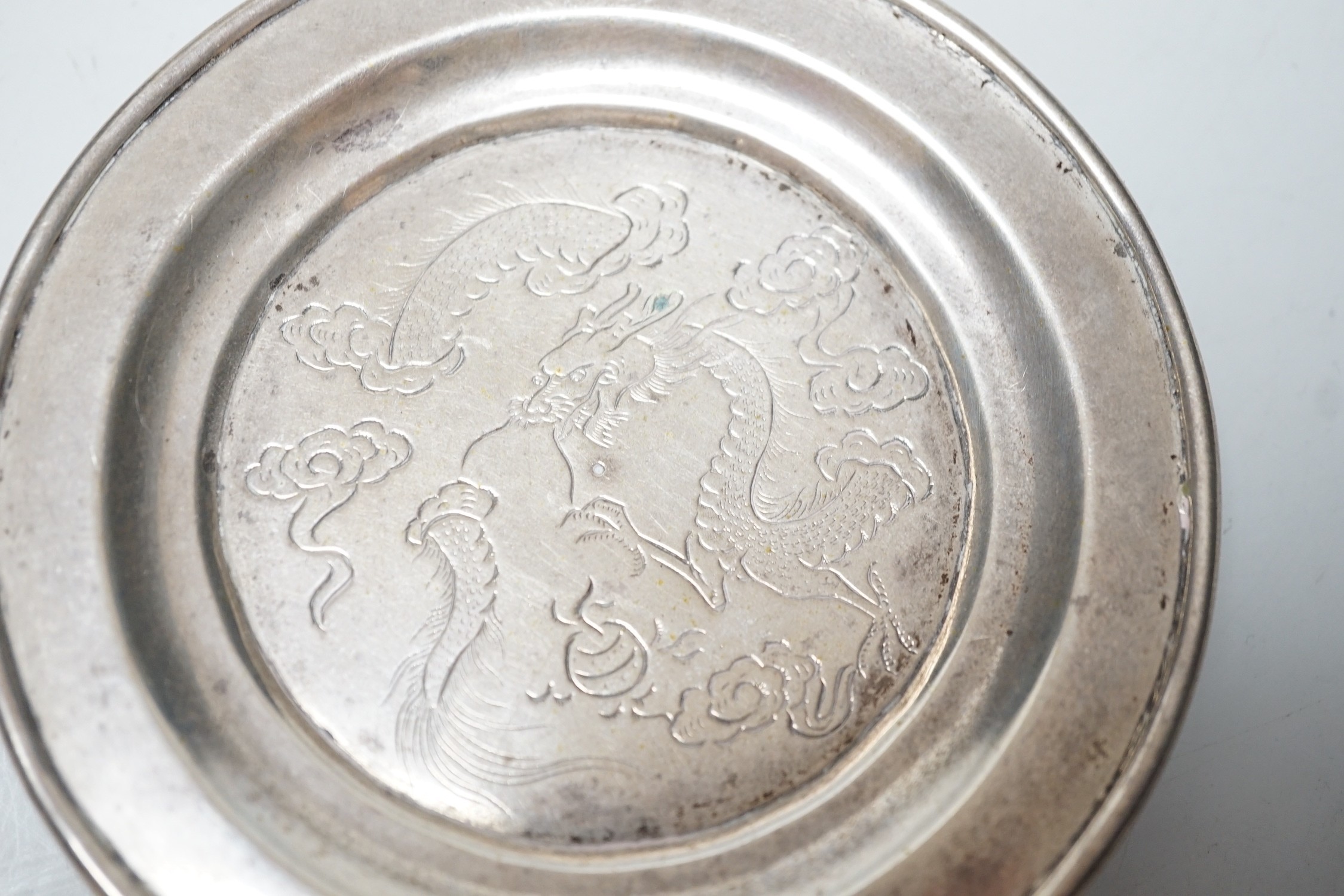 A Chinese white metal small dish, engraved with dragon, diameter 11.3cm, 121 grams.
