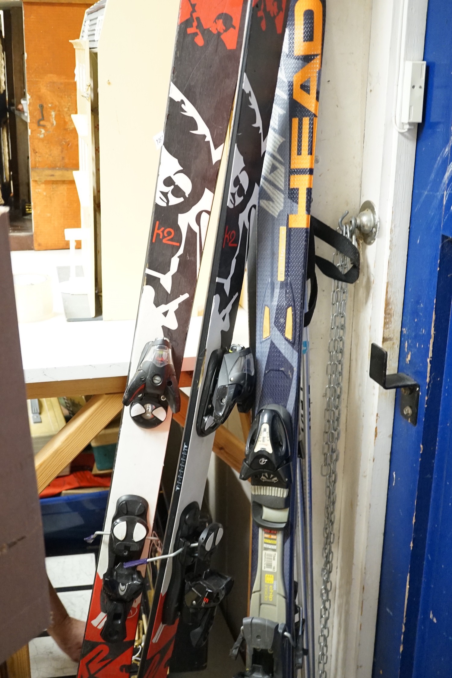 A pair of K2 skis, a pair of Head intelligence skis and a pair of Lexi ski poles