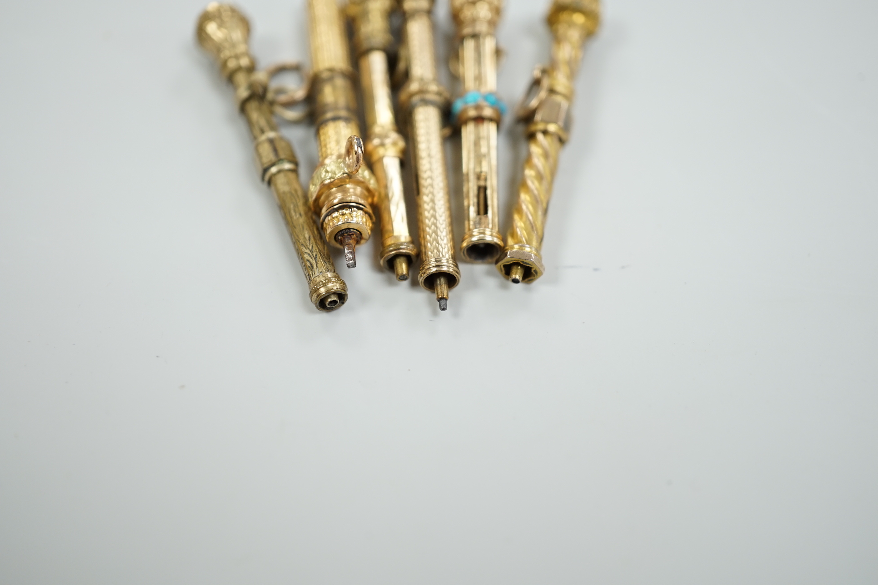 Six assorted late 19th/early 20th century yellow metal overlaid propelling pencils, including turquoise set, 38mm and bloodstone set.