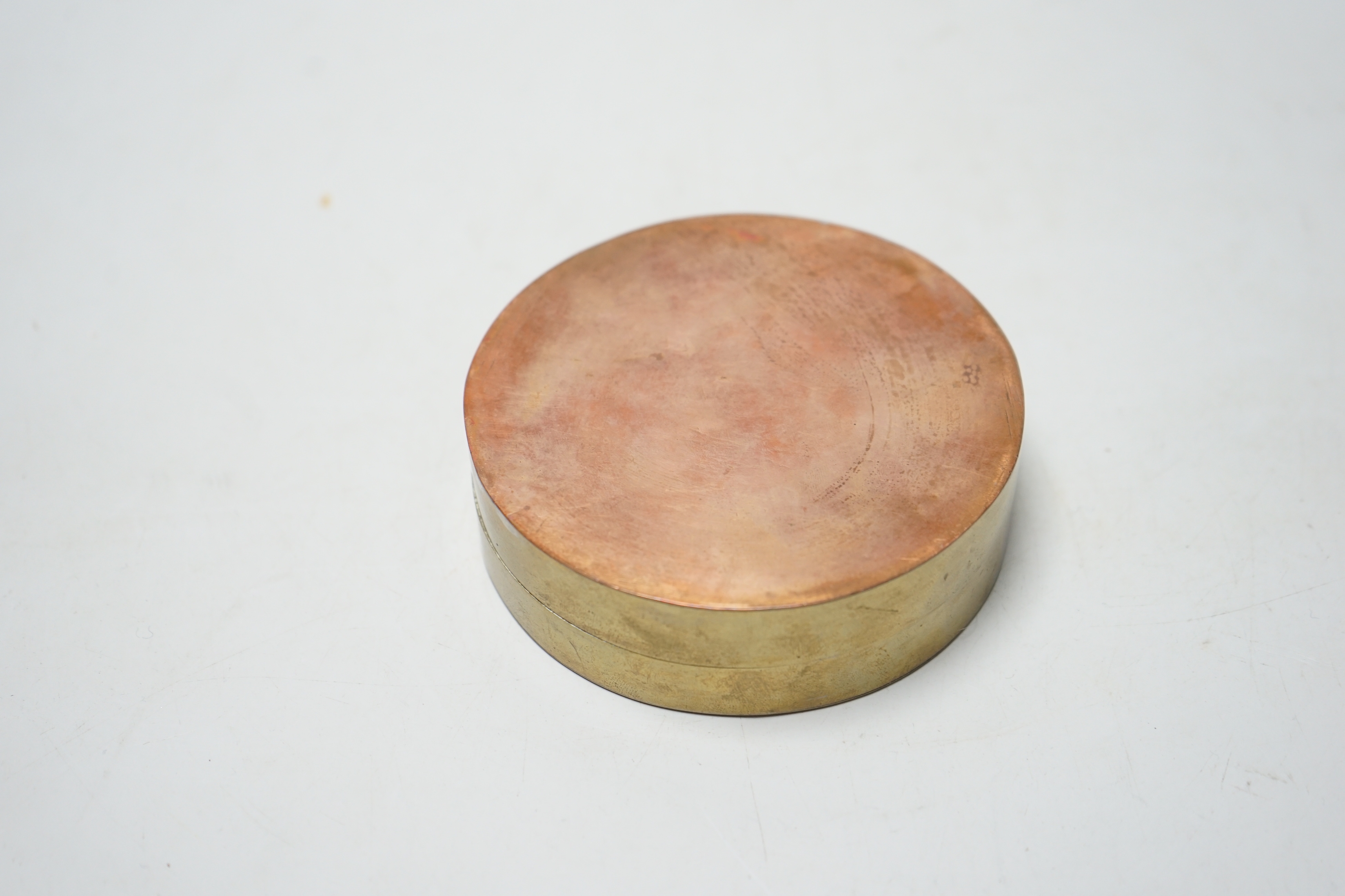 A Chinese paktong inscribed circular ink box, late 19th/early 20th century, 10cm in diameter