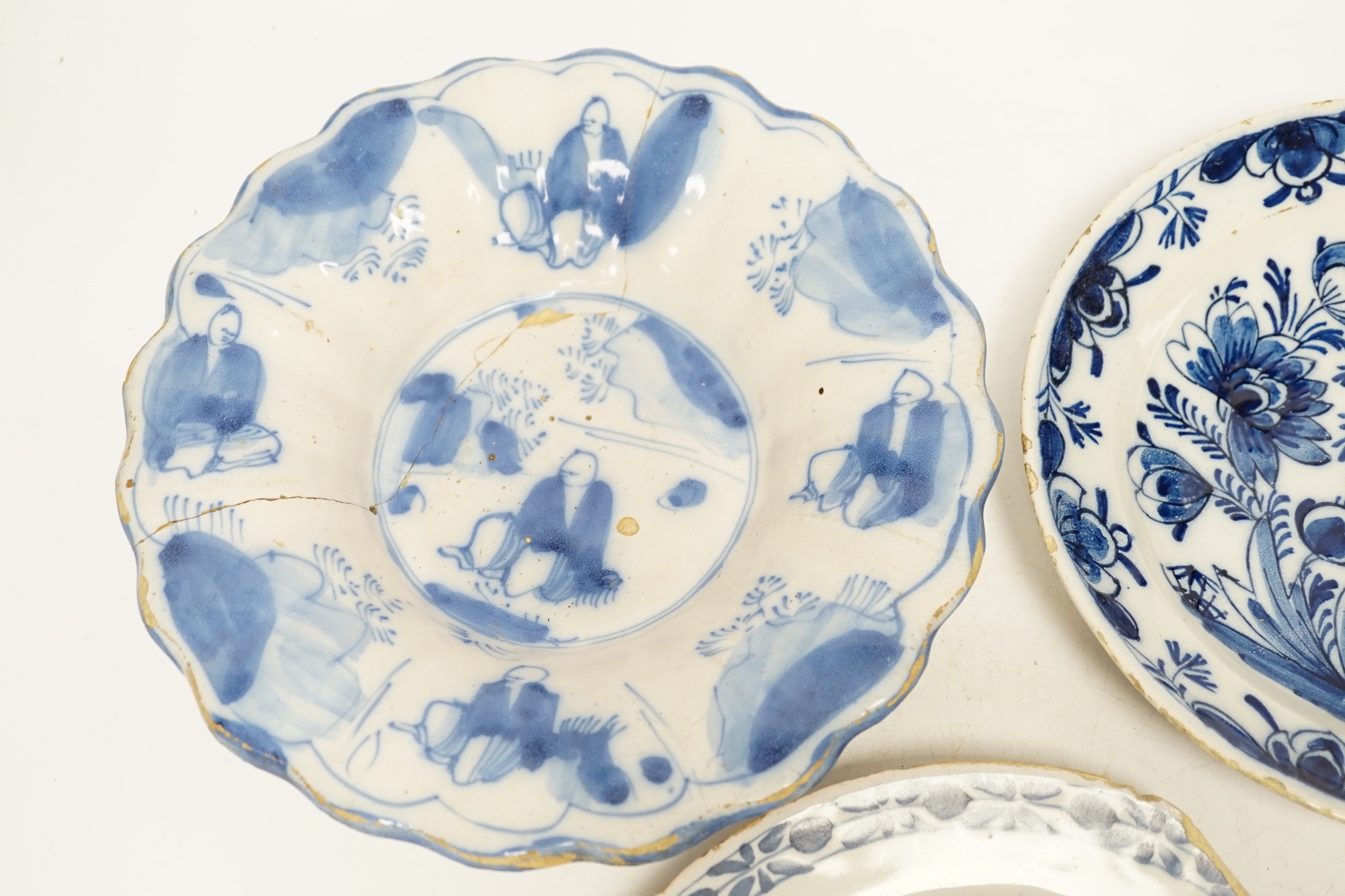 A Delft lobed blue and white dish, 1680-1700 and two 18th century Delft plates, largest 21cm in diameter