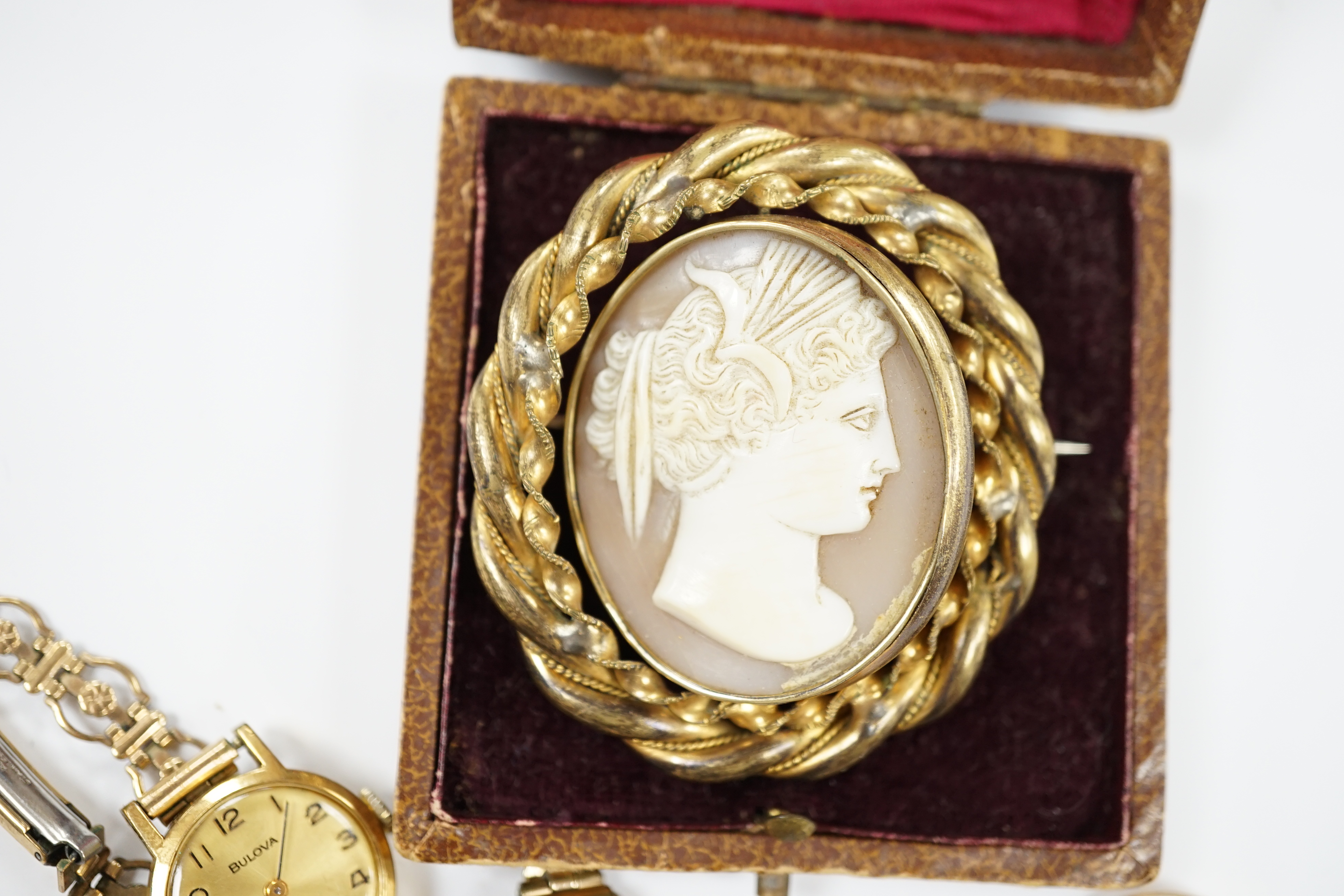 A Victorian 15ct gold and four (ex 5) stone garnet set half hoop ring, an 18ct gold ring, two lady's wrist watches including 9ct gold cased, a 9ct gold cross pendant and a gilt metal and cameo shell set brooch.