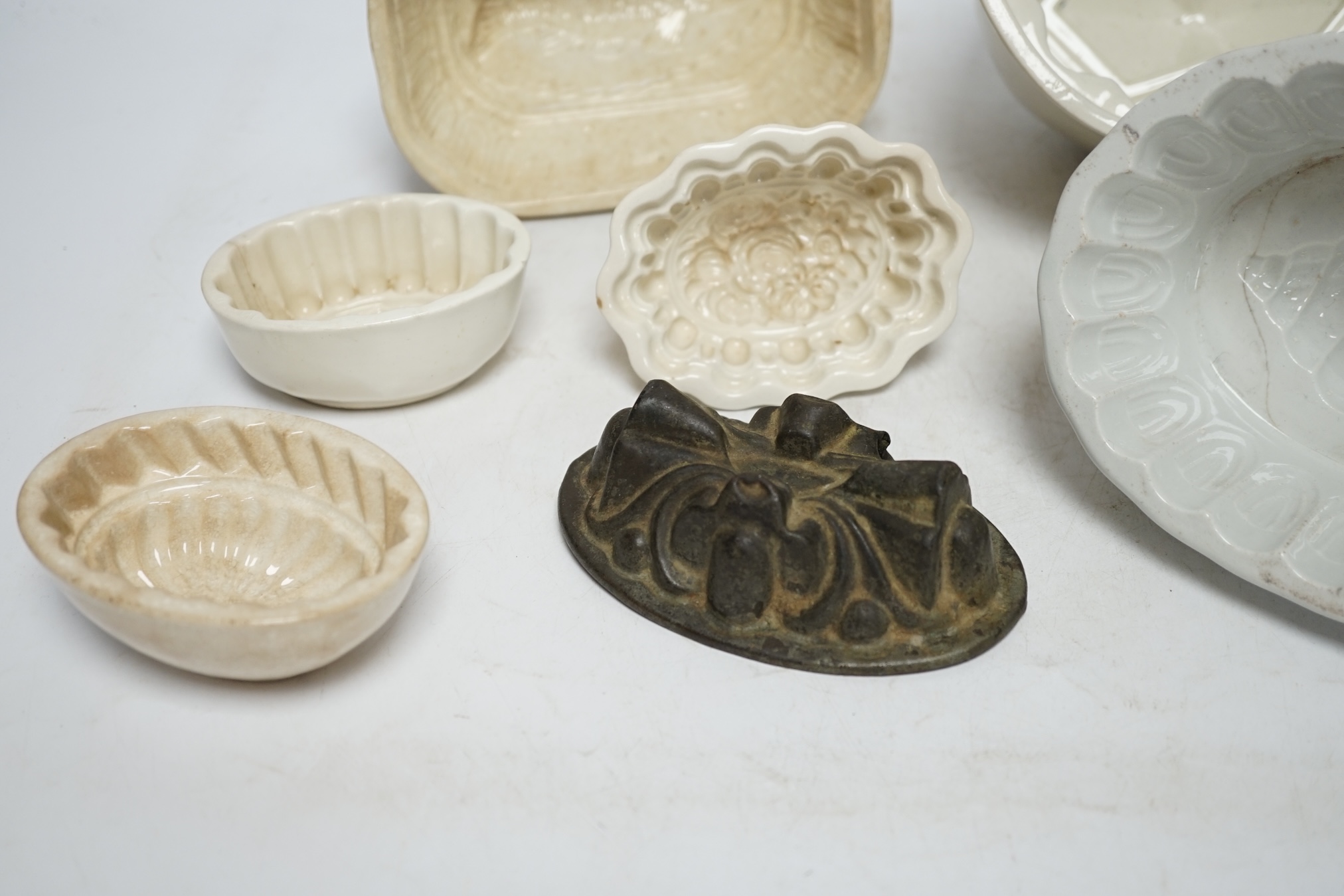 From the Studio of Fred Cuming. Seven jelly moulds including six ceramic examples, one Cetemware, largest 17cm wide. Condition - fair, one cracked Note: “This is an interesting side lot of art and artistic ephemera from the extensive collection of Fred Cuming RA and his wife Audrey, who travelled and worked together around the UK and Europe. They were avid collectors of objects, anything curious or beautiful, many of these items would have caught their eye for some rare aesthetic or technical quality but quite often many items would simply have possessed a unique and naïve charm. There are several pieces that may have been the work of a student or amateur, nevertheless they found them exquisite. The majority of pieces from this small collection were displayed in their home for many years among an incredibly rich and varied array of his own work and that of his contemporaries. They would have been purchased over the course of a period spanning five decades or more, from the family’s early beginnings at Egerton House in Kent, Hythe, Wittersham and finally Iden in East Sussex where the family settled.”