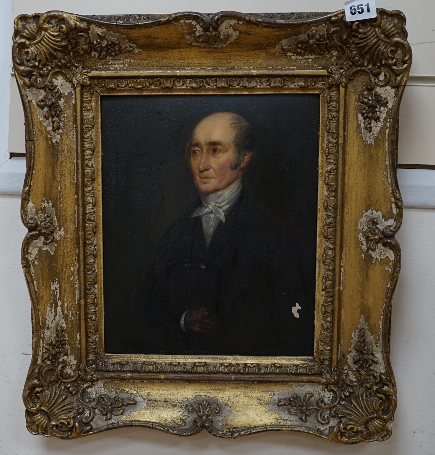 Lot 651 , 19th century English School, oil on board, Portrait of Duncan Moon, born April 17th 1776, inscribed in ink and various labels verso, 29 x 24cm, gilt frame. Condition - poor