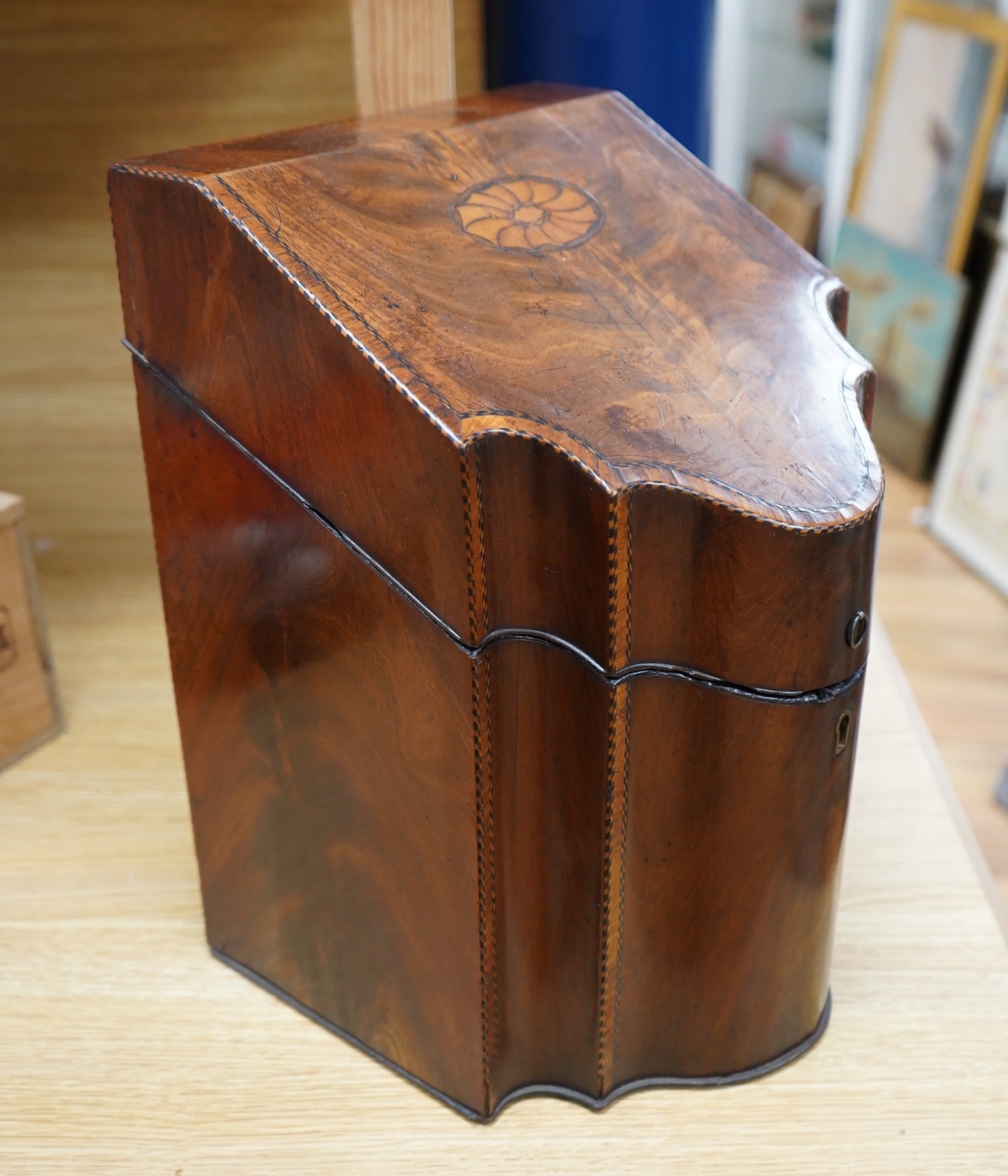 A George III mahogany shell inlaid knife box, 35cm high. Condition - good