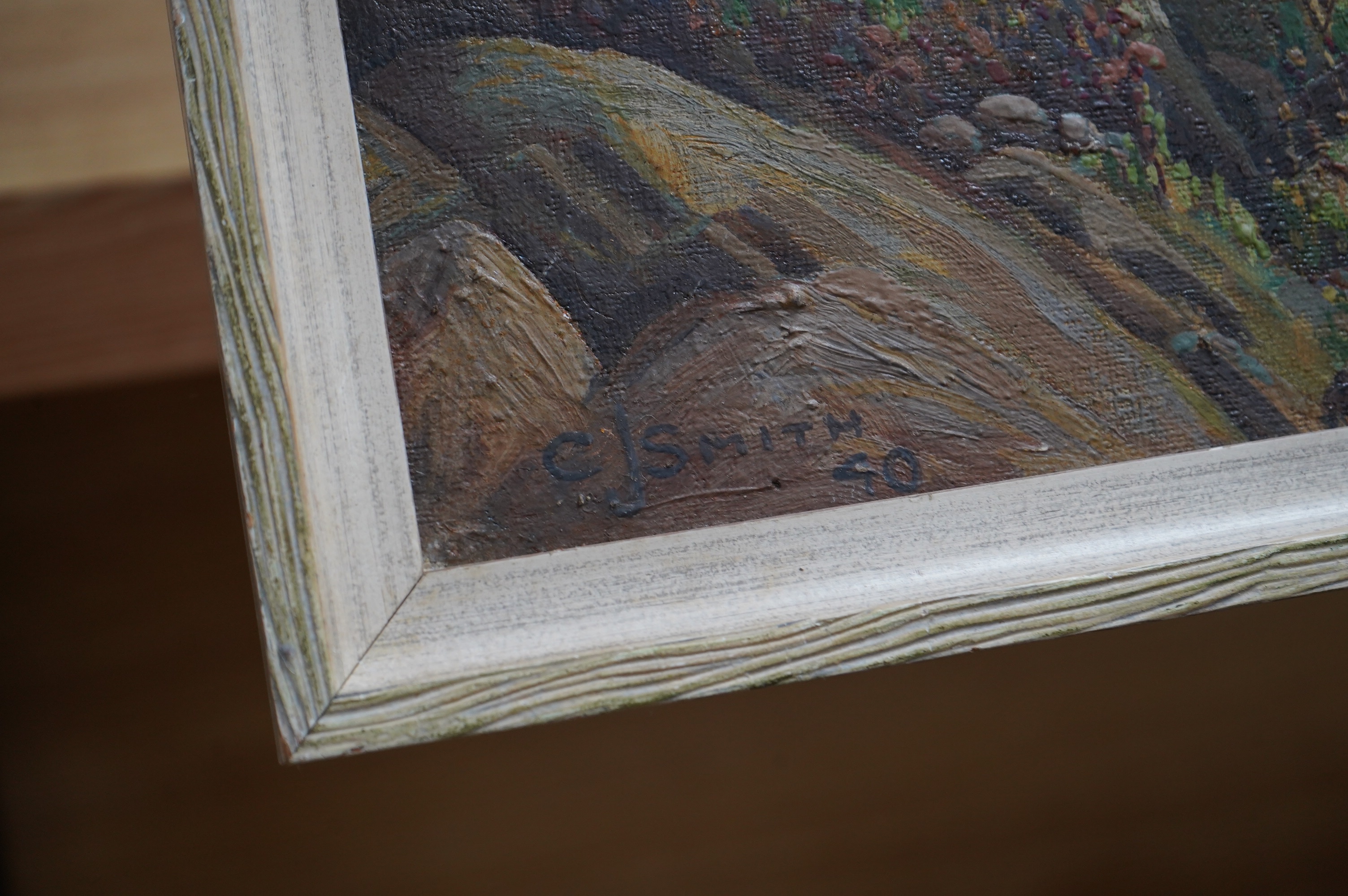Lot 702 , C. J. Smith, mid 20th century oil on canvas, Mountainous landscape with stream, signed and dated '40, 34 x 49cm. Condition - fair