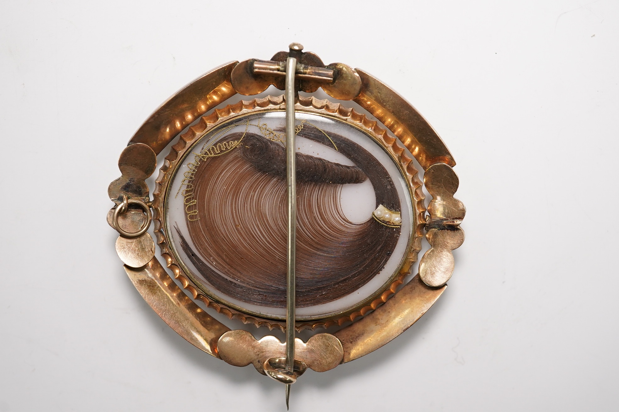 Lot 925 , A cased Victorian yellow metal and plaited hair sey oval mourning brooch, 59mm. Condition - fair