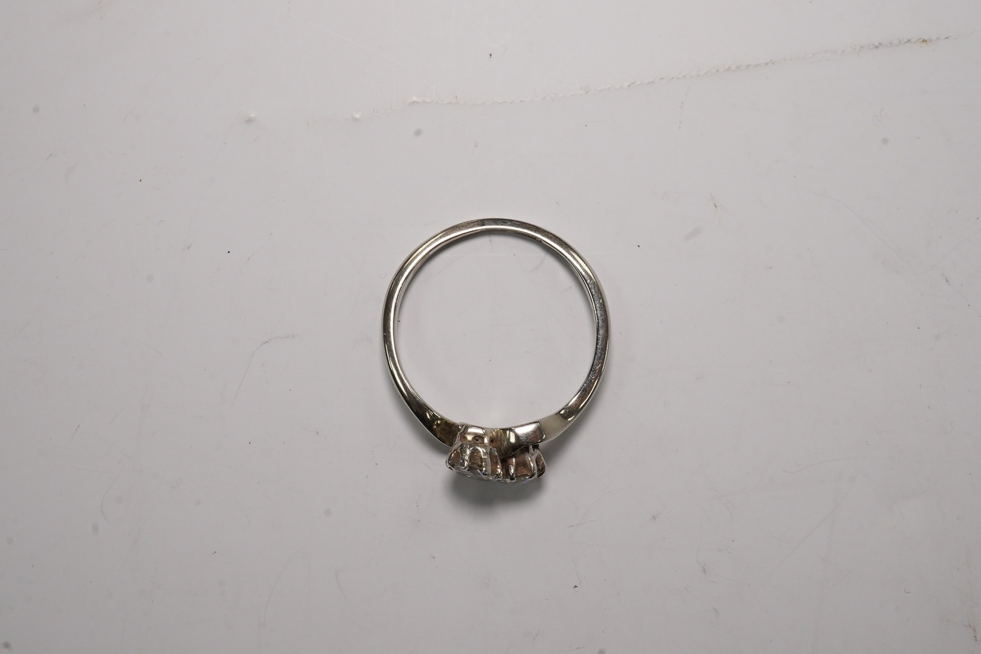 Lot 938 , An 18ct, plat and two stone diamond set crossover ring, size O, gross weight 2.3 grams, Condition - fair to good