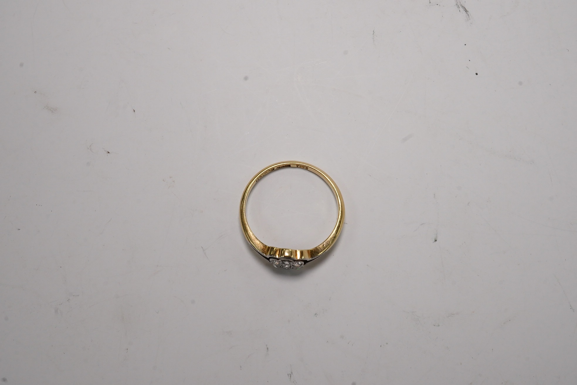 A 1940's 18ct, plat and diamond set flower head cluster ring, size O, gross weight 2.1 grams.