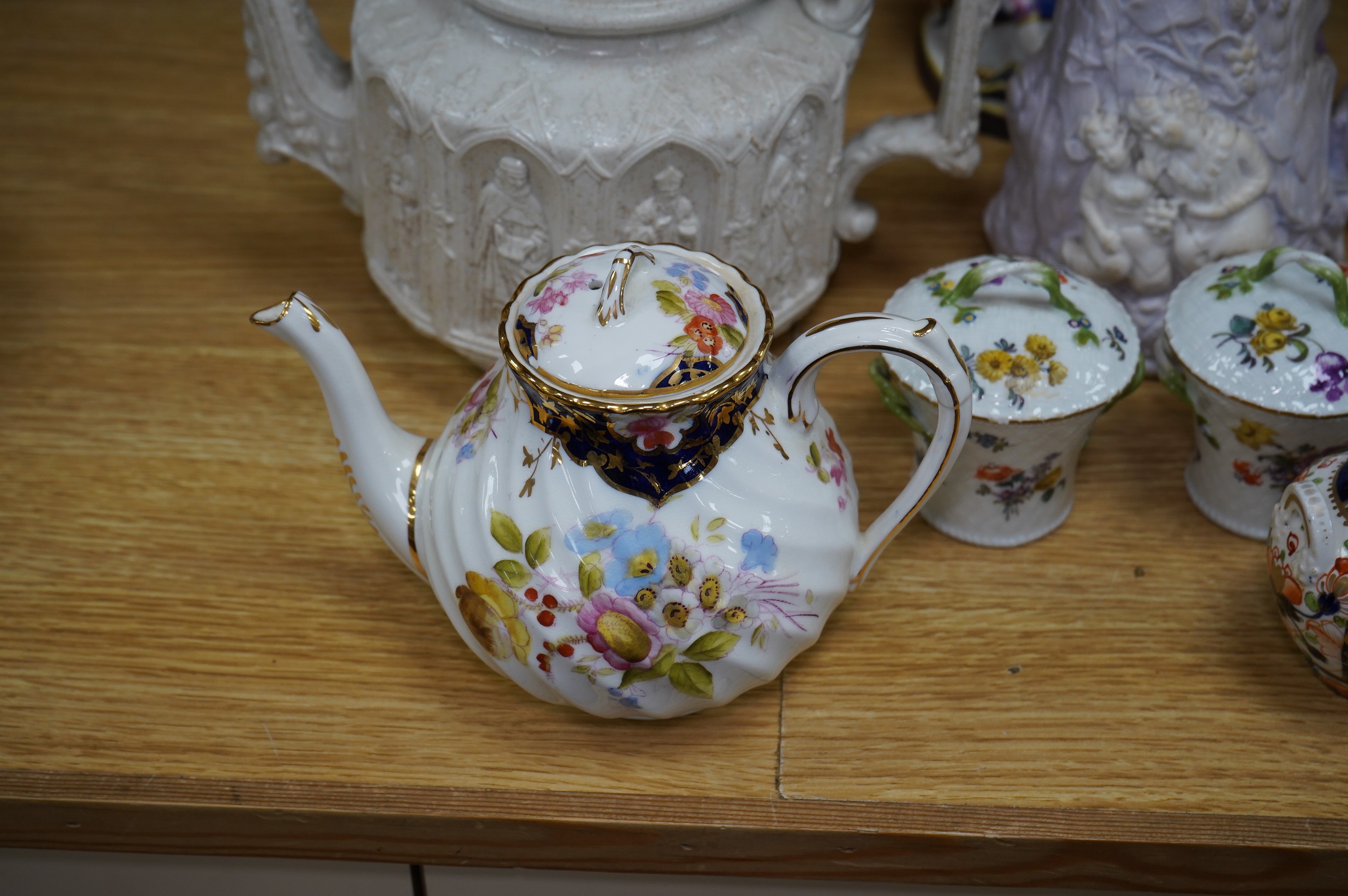 A quantity of 19th and early 20th century ceramics including two chess playing groups, four further Continental figures, a copy of a Meigh teapot, three cups and saucers, two Meissen pots and covers, etc. Condition - varies, poor to good