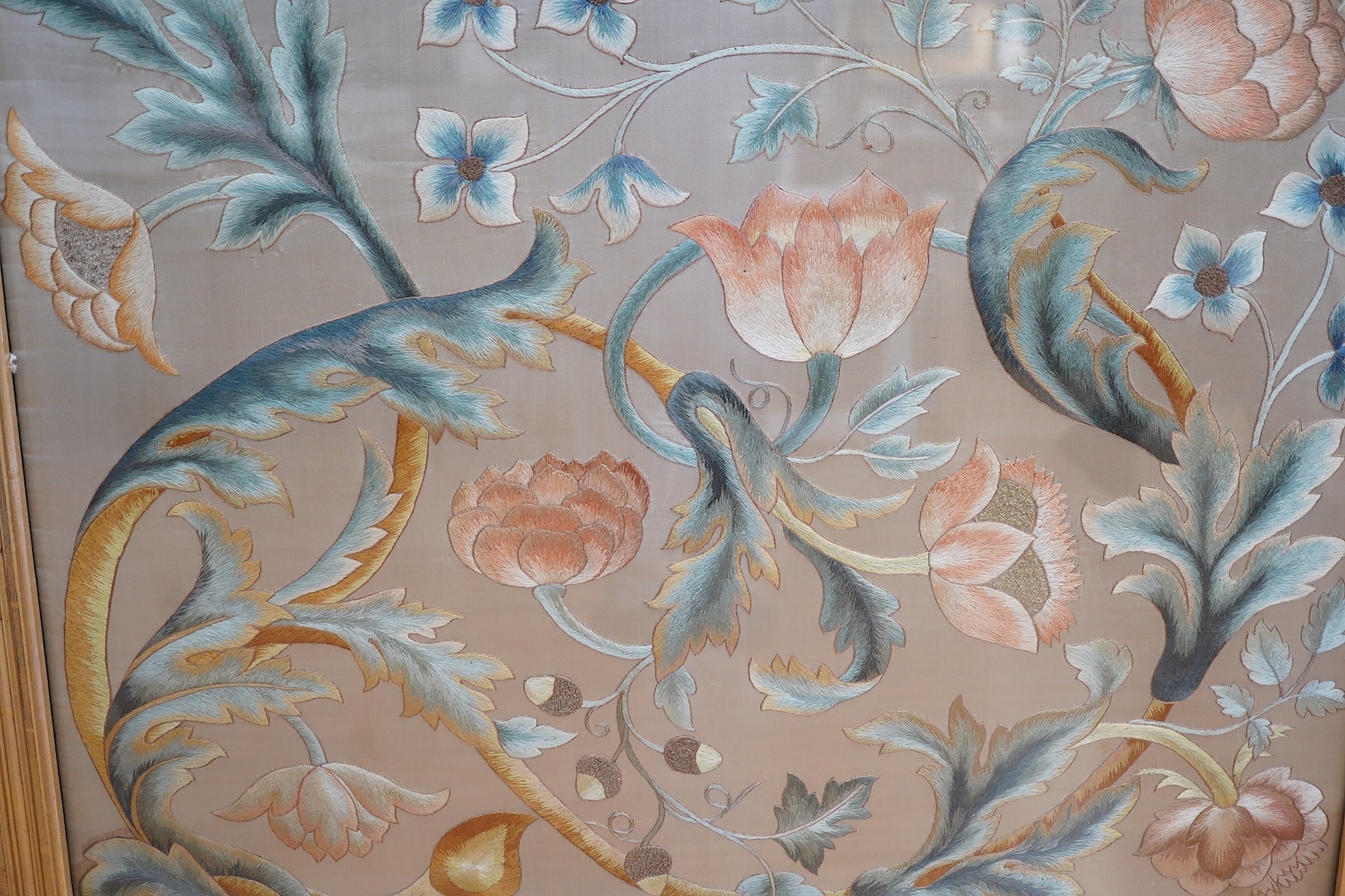 A 19th century Arts and Crafts floral polychrome silk embroidery on cream silk, in the William Morris style, in gilt painted frame. 76cm wide x 64cm high. Condition - two water marks to the top right side and bottom right side of embroidery. The embroidery only slightly stained near the base.