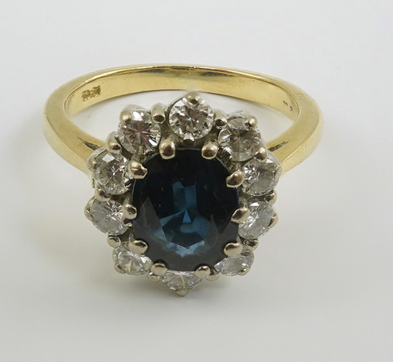 Lot 260 , A modern 18ct gold, sapphire and diamond set oval cluster ring