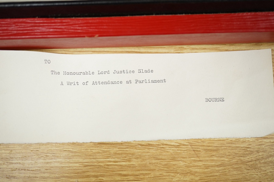 The Hon. Lord Justice Slade, ‘A Writ of Attendance at Parliament’, two vellum documents with ERII red seals in a red fitted case with a gold Royal Coat of Arms stamp, case 59cm wide x 23cm deep. Condition - some foxing