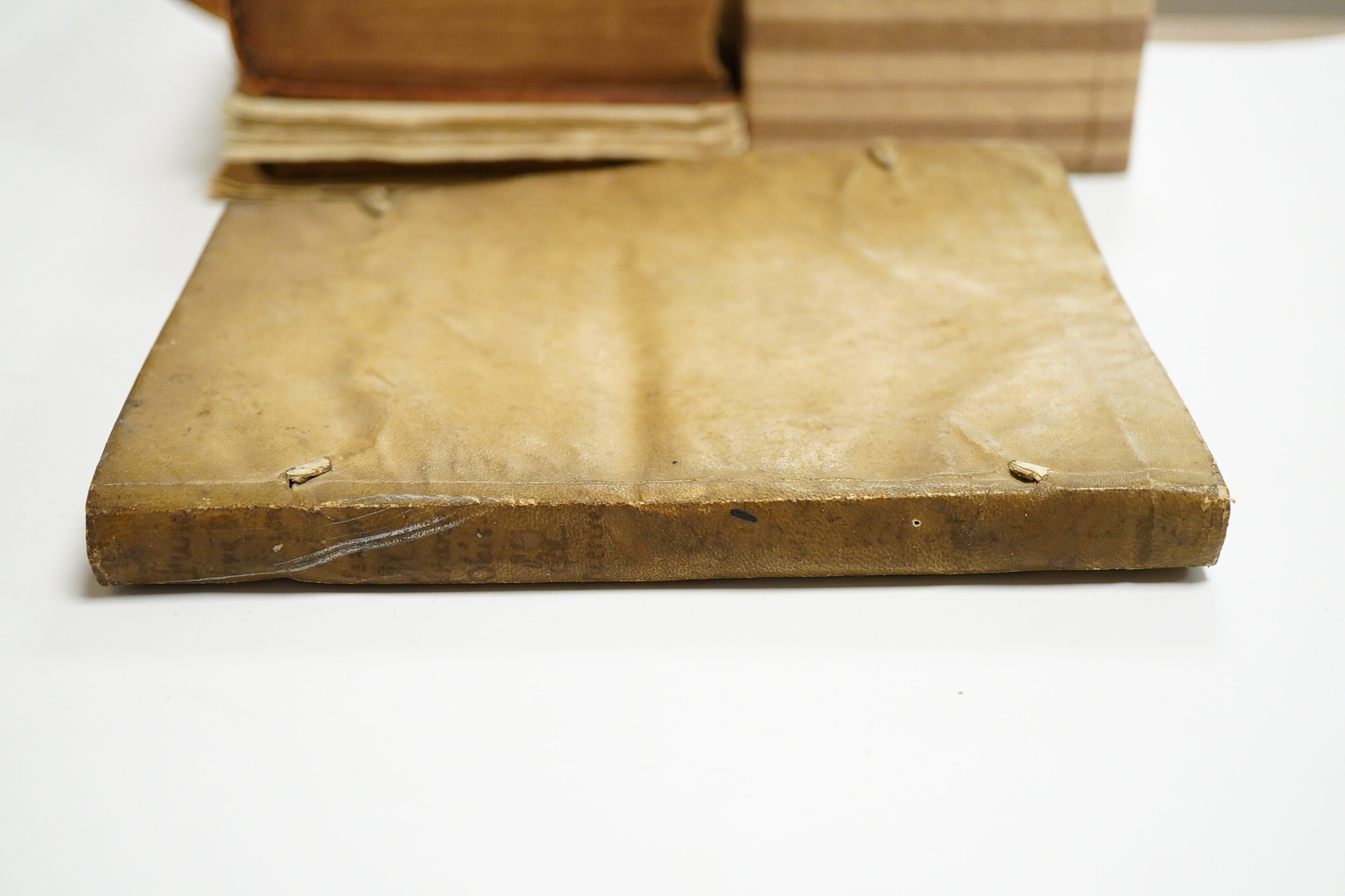 vellum marked and lacks ties, brown marginal stain, 10 leaves towards end, some marginal worm and sm. tears, a lt. scoring. (97)ff. 32, (11)pp.