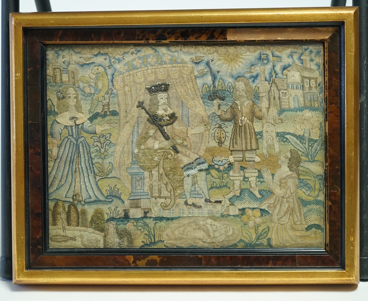 An 17th century petit point embroidered panel housed in a tortoise shell and gilt frame. The embroidery depicting Charles I, within a tent, with Henrietta Maria looking at a gentleman dangling a boy in one hand and sword in the other, with the mother pleading for the Kings mercy. The embroidery worked in places with raised stump work, beading and a variety of stitches and threads. Please see label on reverse. 33cm wide x 24cm high. Condition - both the condition of the embroidery and colours are strong. The frame has a portion of the tortoiseshell veneer and two ebony slips missing. Provenance: Part of the collection of Mr & Mrs Myron C. Taylor, Killingworth, Locust Valley, Long Island, NY, USA.