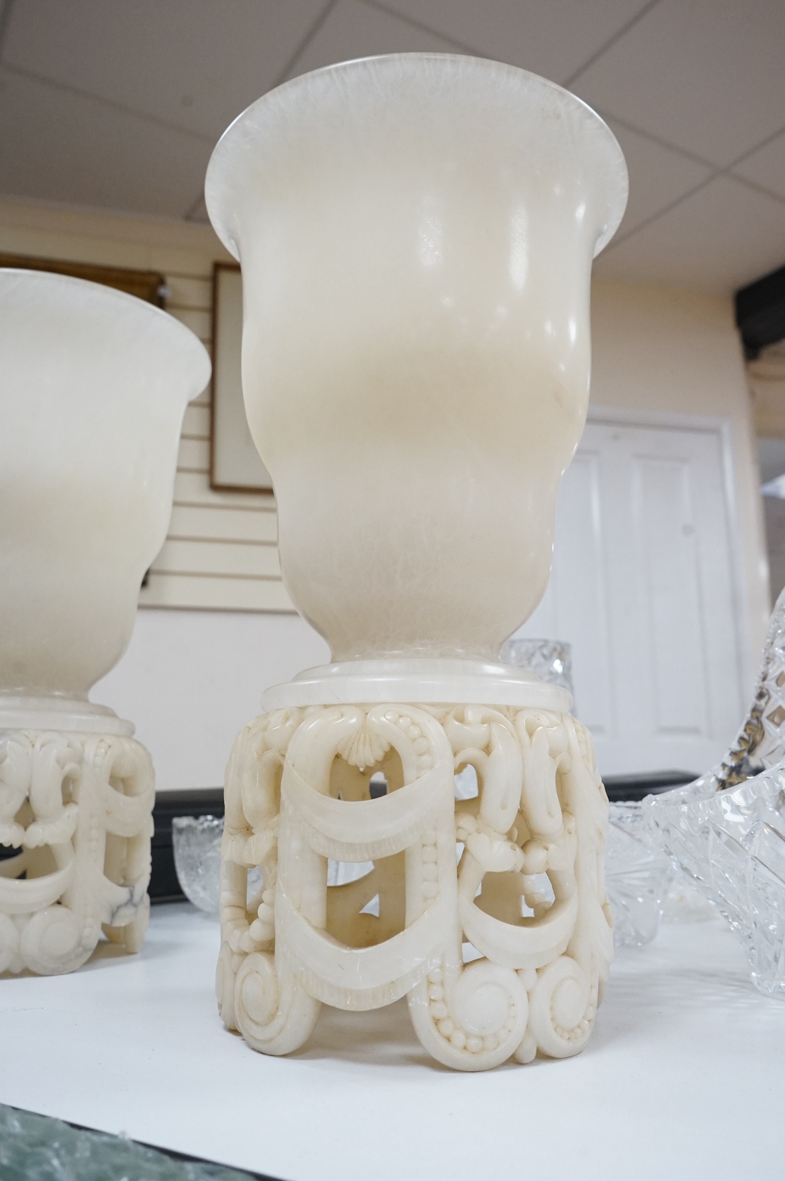 A pair of French Art Deco alabaster carved table lamps in a Chinese style, 42cm high. Condition - fair/good, untested