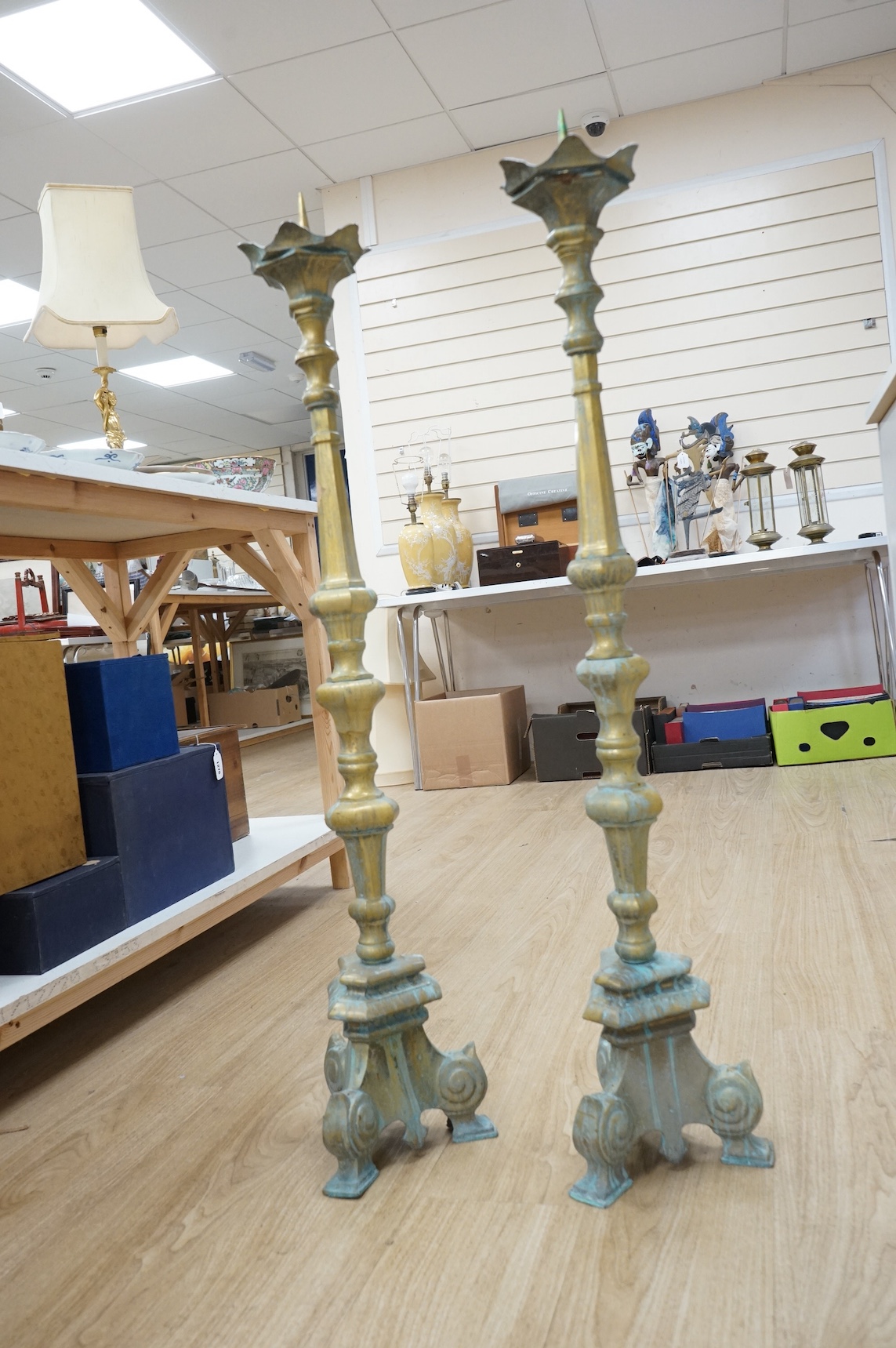 A pair of brass floor standing pricket candlesticks, 110cm high. Condition - both have verdigris and one top plate is cracked.