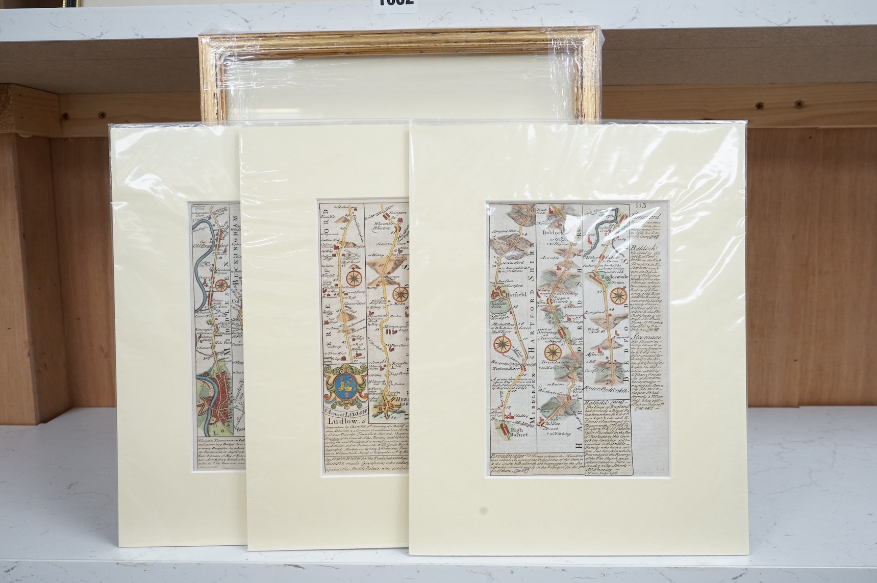 Five 17th century and later road maps to include John Ogilby, hand coloured engraved road map, London to Aberystwyth, largest 32 x 43cm. Condition - fair