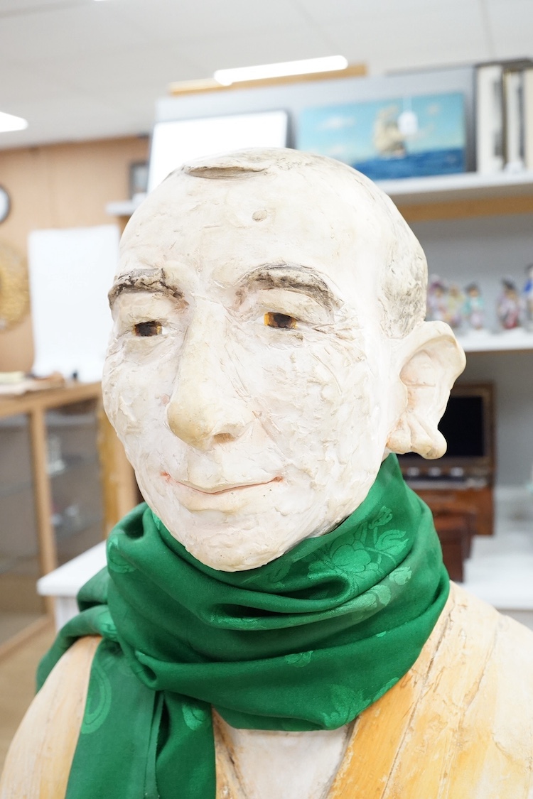 A modern polychrome plaster bust of a Tibetan monk with green silk damask scarf, 66cm high. Condition - various chips to base