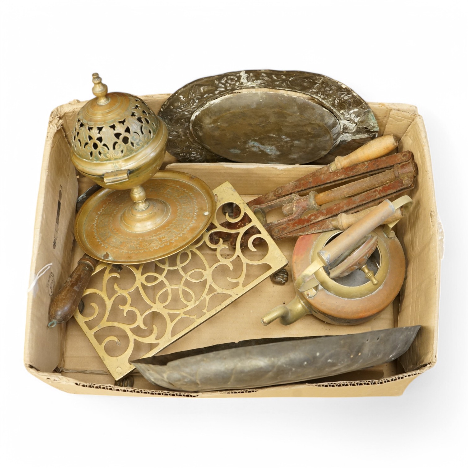 A 17th century Nuremburg embossed brass alms dish, and other metalware, dish 34cm. Condition - worn