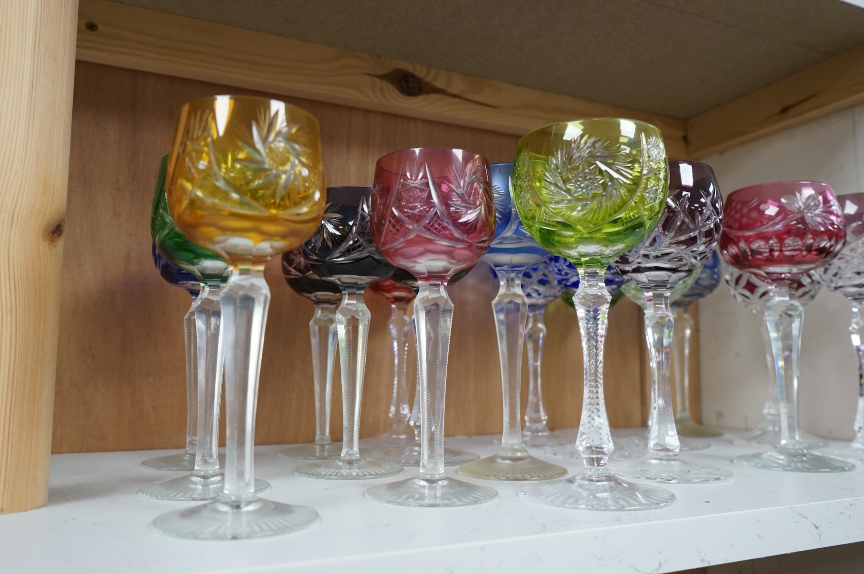 Twenty various Bohemian cut wine glasses, with coloured bowls, 21cm high.