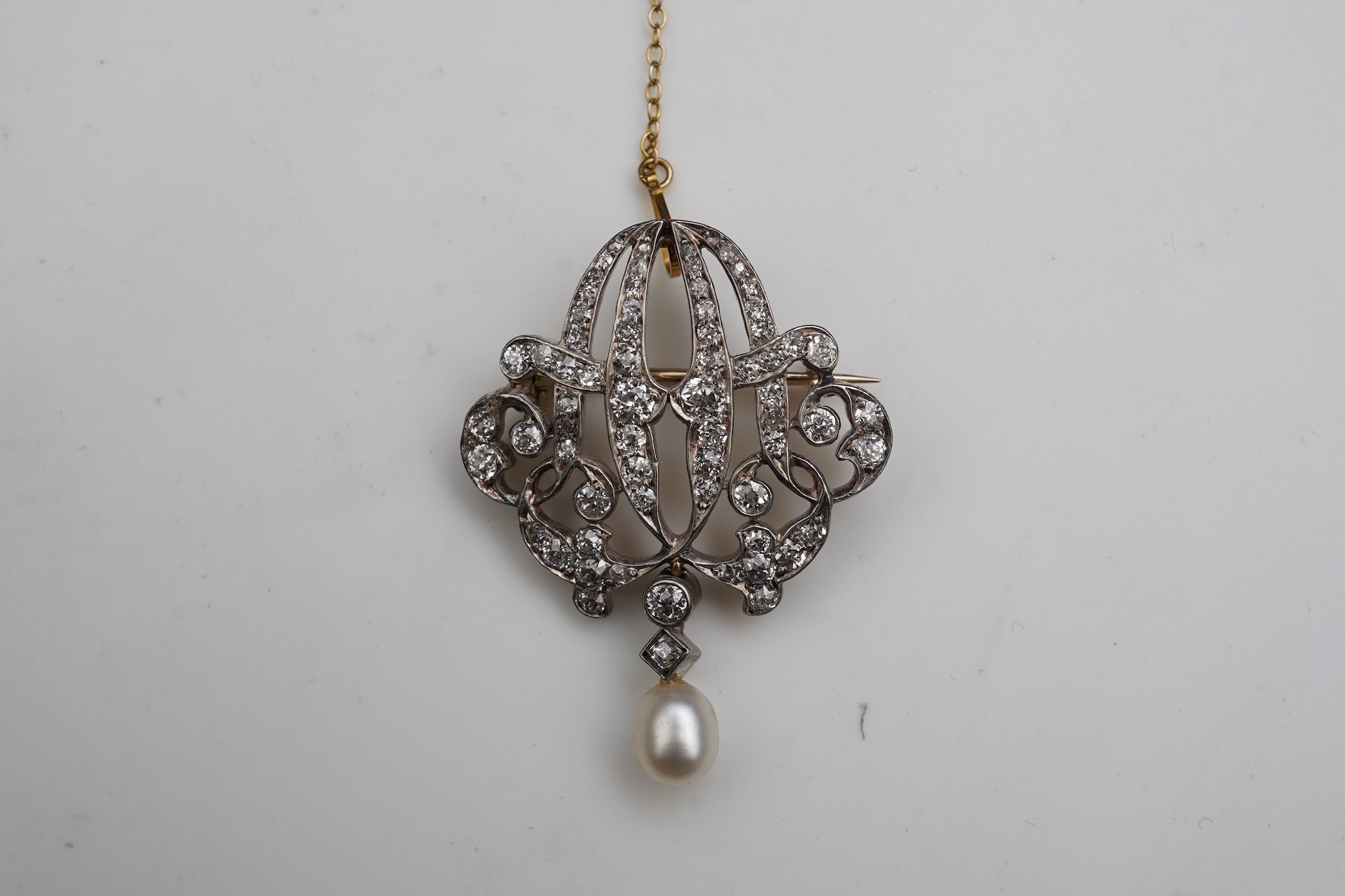 A late Victorian pearl and diamond monogram brooch, circa 1900, designed as the conjoined initials AA, set with circular-cut diamonds totalling approximately 2.00 carats, suspending a pearl pendant measuring approximately 6 x 6 x 7mm, mounted in silver and gold, length 4cm, pearl untested