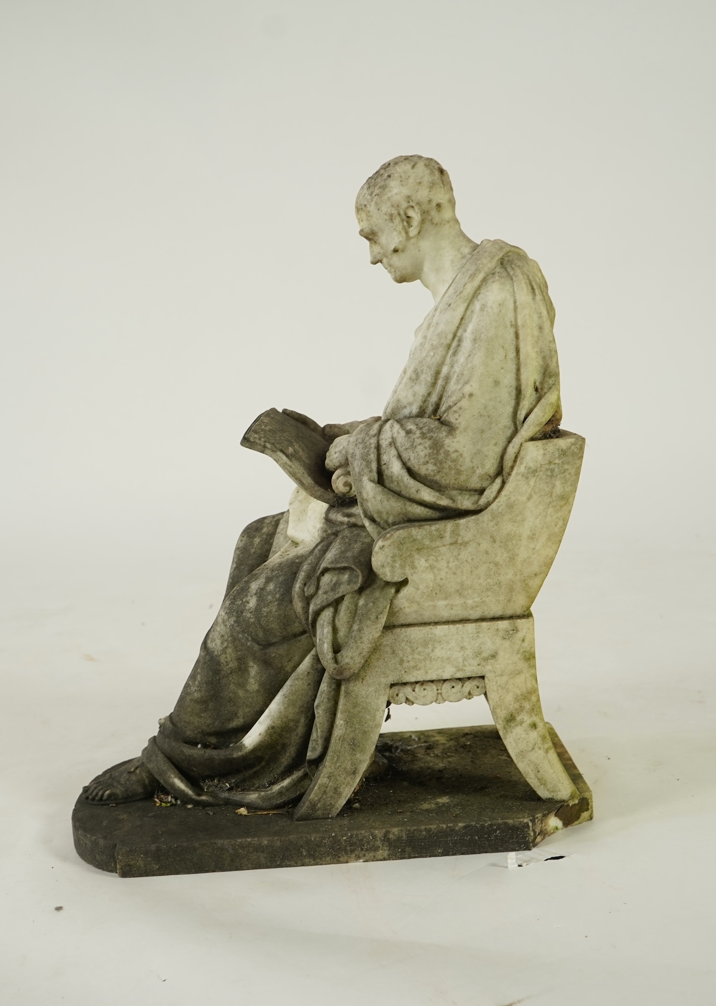 A marble sculpture of a gentleman dressed as a Greek philosopher, seated in a klismos chair, first half 19th century, holding a text and a second scroll, his seated pose based on Antique figures of Meander, unsigned, 54.5cm high, 43.5cm long