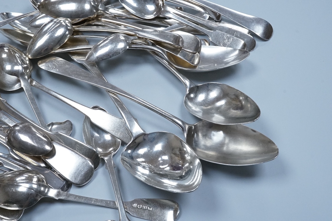 A quantity of assorted mainly 18th and 19th century silver flatware, various patterns, dates and makers, mainly teaspoons but including a pair of George III Old English pattern table spoons, by Hester Bateman, London, 1774, 21.3cm and a set of three 19th century Scottish table spoons, 37.1oz.