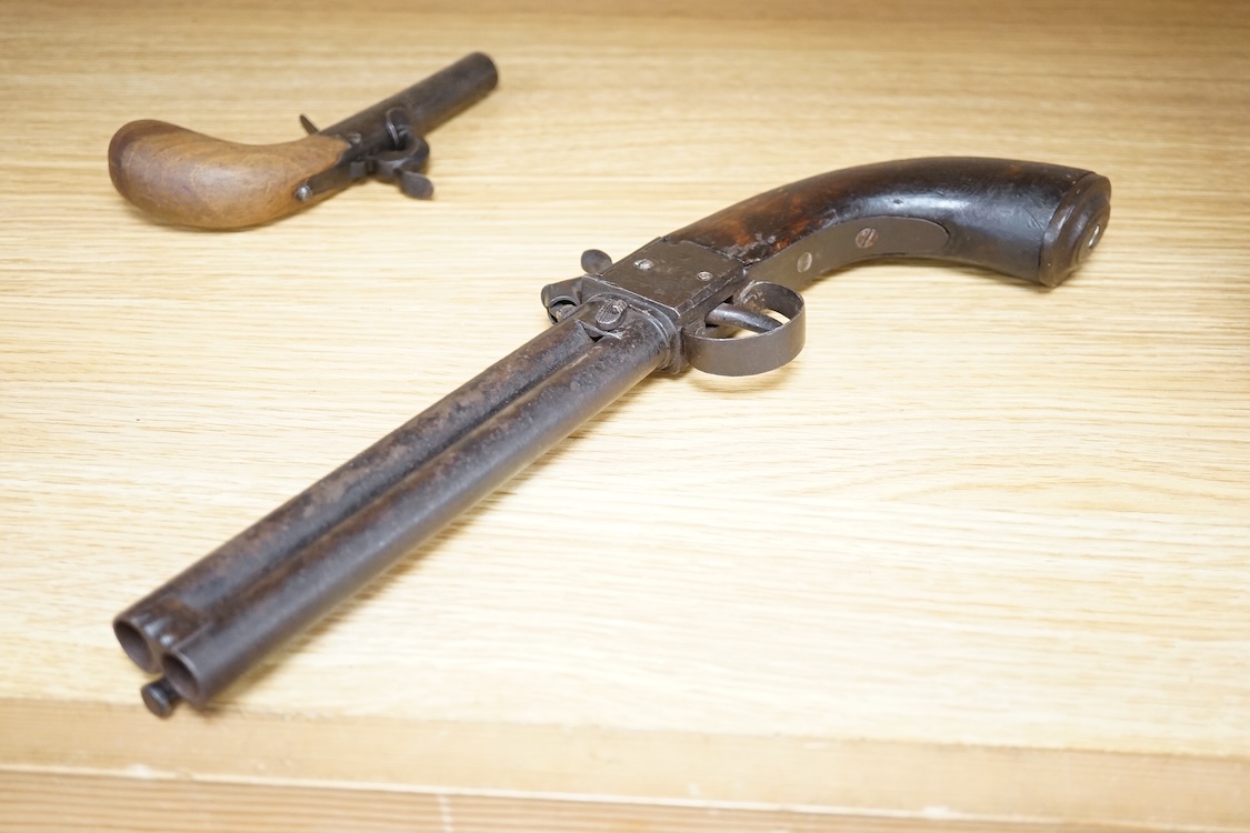 Lot 274 , A boxlock percussion pocket pistol with Damascus twist turn off barrel, liege proofs, rounded wooden grip replaced, together with an ‘over and under’ boxlock percussion pistol