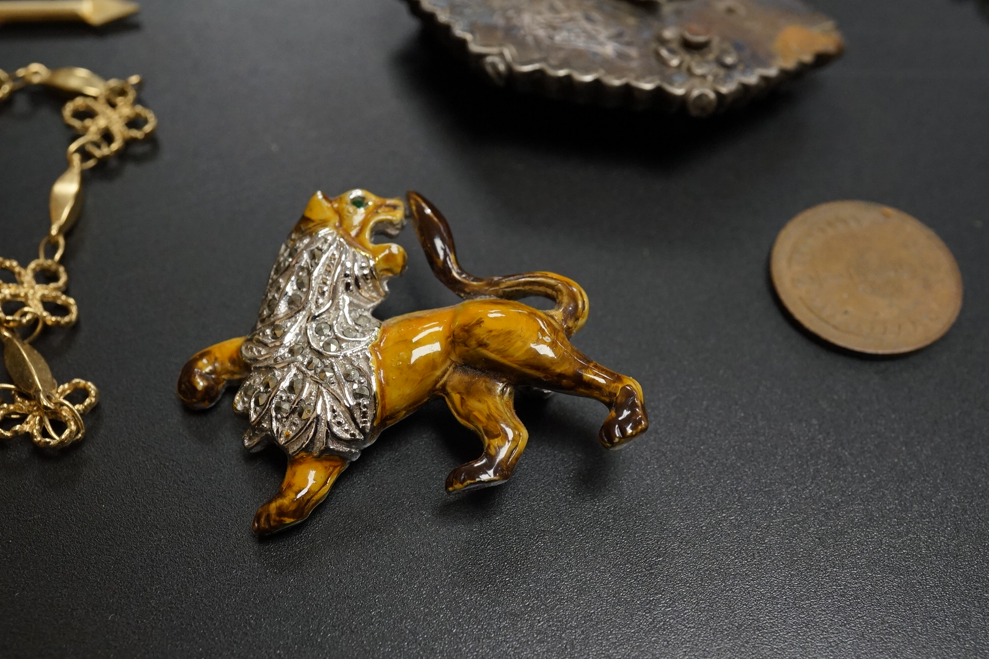 Lot 1906 , A small group of assorted costume and other jewellery, including a late Victorian silver hexagonal brooch(a.f.) a platinum and gem set ring and two pens Waterman and Elysee.