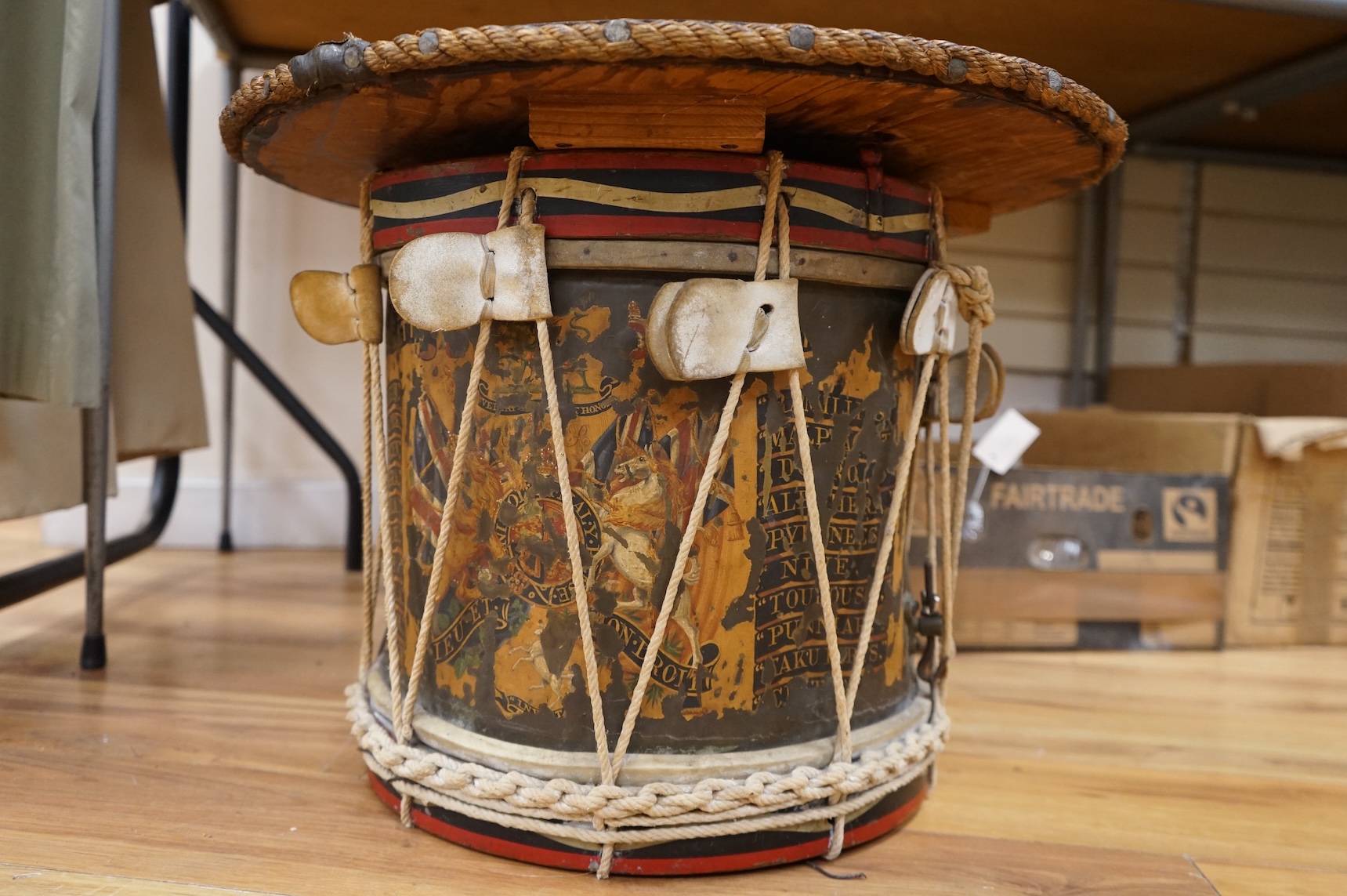 Lot 325 , A late 19th/early 20th century Royal East Kent Regiment 'Buffs' regimental drum, 37cm diameter, 37cm high, together with a rope edged, stained pine removable 'table top' adaption