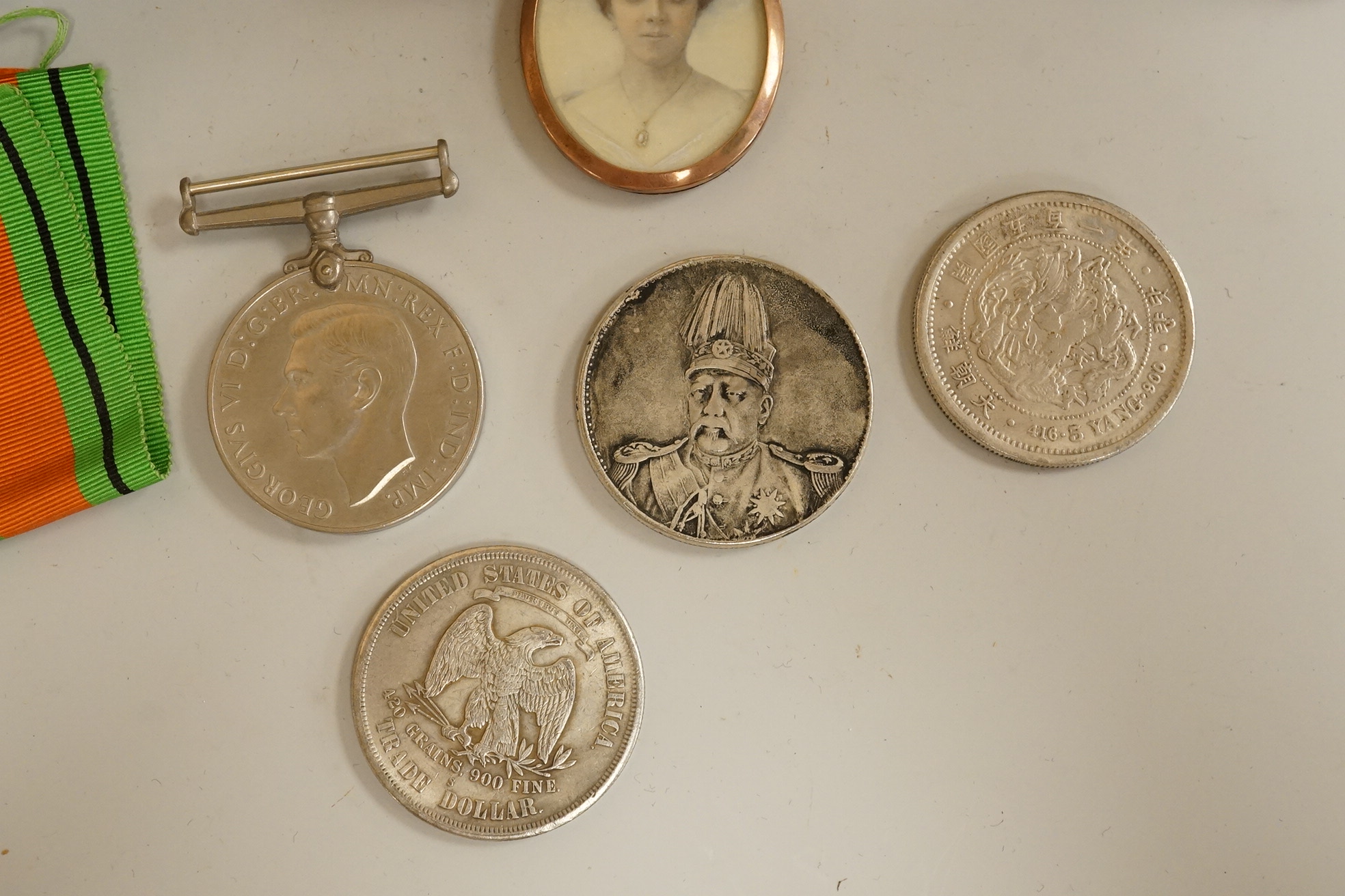 A large cloisonné enamel box containing a cast mask handle, an oval hair pendant, coins and medals, etc.