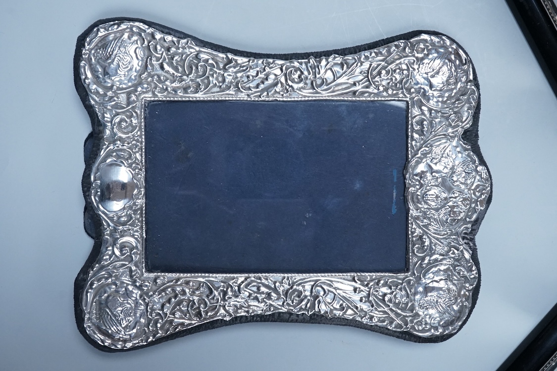 Two modern silver mounted ebonised desk calendars, including one retailed by Asprey, width 21.3cm and a modern silver mounted photograph frame.