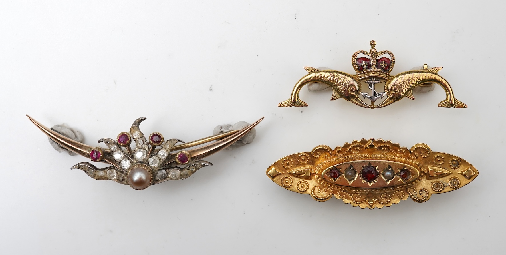 Three brooches, 19th and 20th century, comprising: a Victorian late 19th century brooch designed as a sunburst on a crescent moon, set with cushion-shaped diamonds and circular-cut rubies, centring on a pearl, mounted in silver and gold, length 5.3cm, gross weight approximately 6 grams; a Victorian gold, ruby and pearl panel brooch, length 4.7cm, stamped 9CT, gross weight approximately 2.5 grams; and a Royal Navy Submarine Services 'gold dolphin' badge, depicting two confronted dolphins flanking a crowned anchor, in 9ct gold, accented with red enamel, length 4.1cm, British hallmark, gross weight approximately 3 grams
