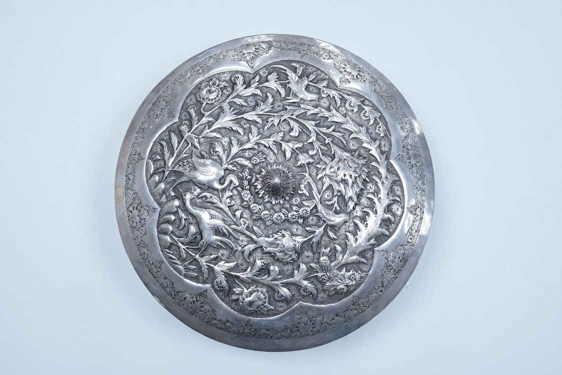 A 20th century Middle Eastern white metal circular box and cover, decorated with birds amongst foliage, base diameter 21.8cm, on three bun feet, 31.7oz.