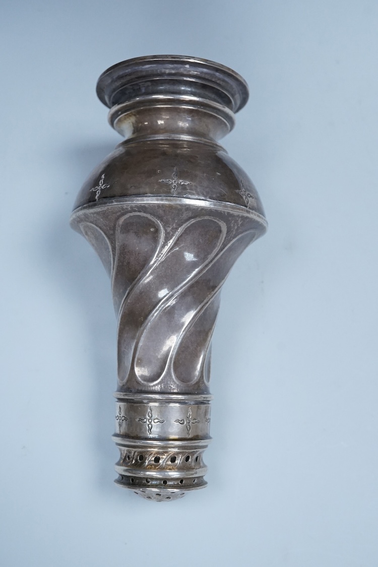 A George V Arts & Crafts silver sugar caster, by Omar Ramsden, with spiral decoration and engraved with stylised stars, London, 1931, 14.9cm, 5.3oz.