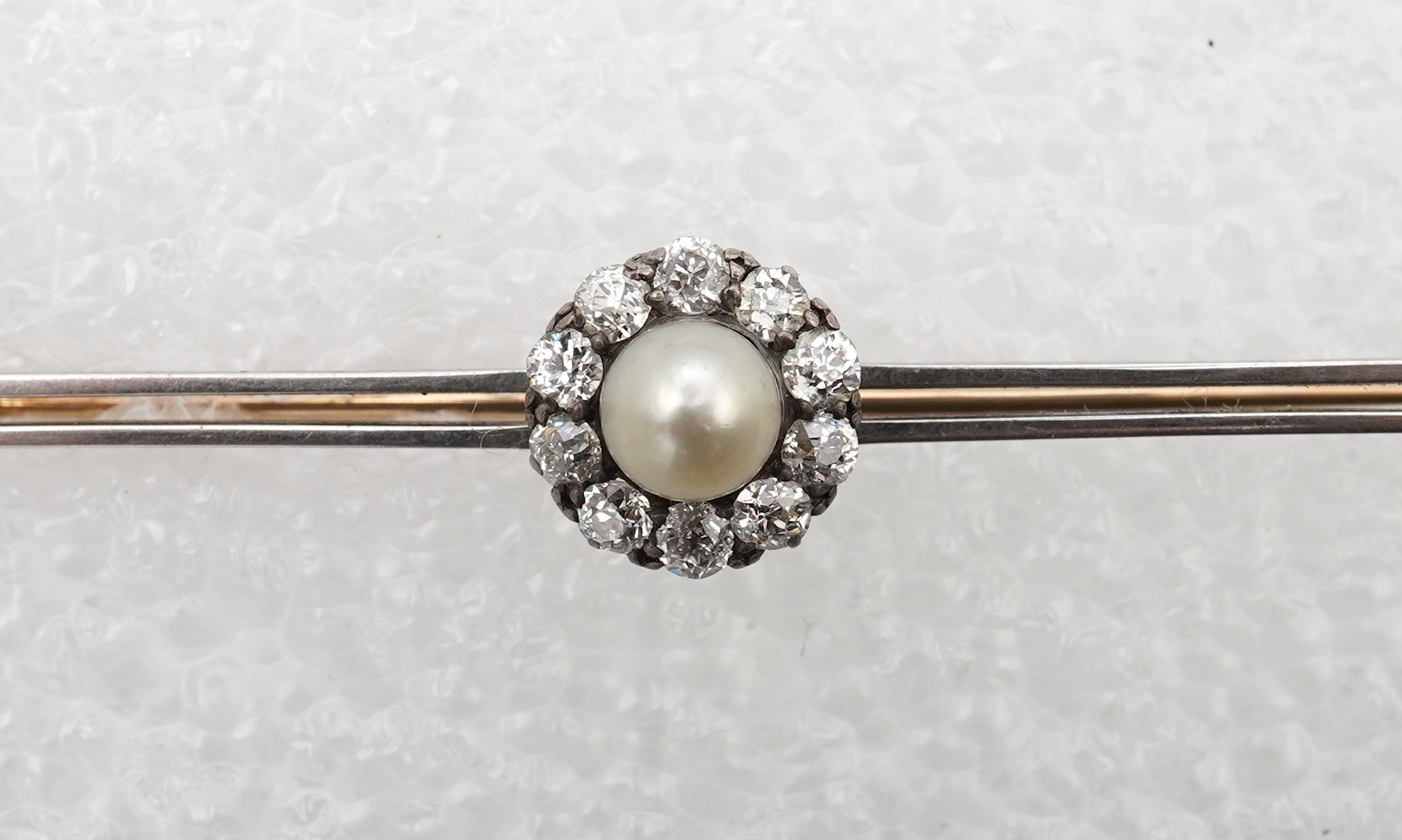 A pearl and diamond brooch, early 20th century, centring on a bouton-shaped pearl measuring approximately 5.5mm diameter, within a border of circular-cut diamonds totalling approximately 0.70 carats, to a bar brooch, mounted in silver and gold, length 6.3cm, pearl untested
