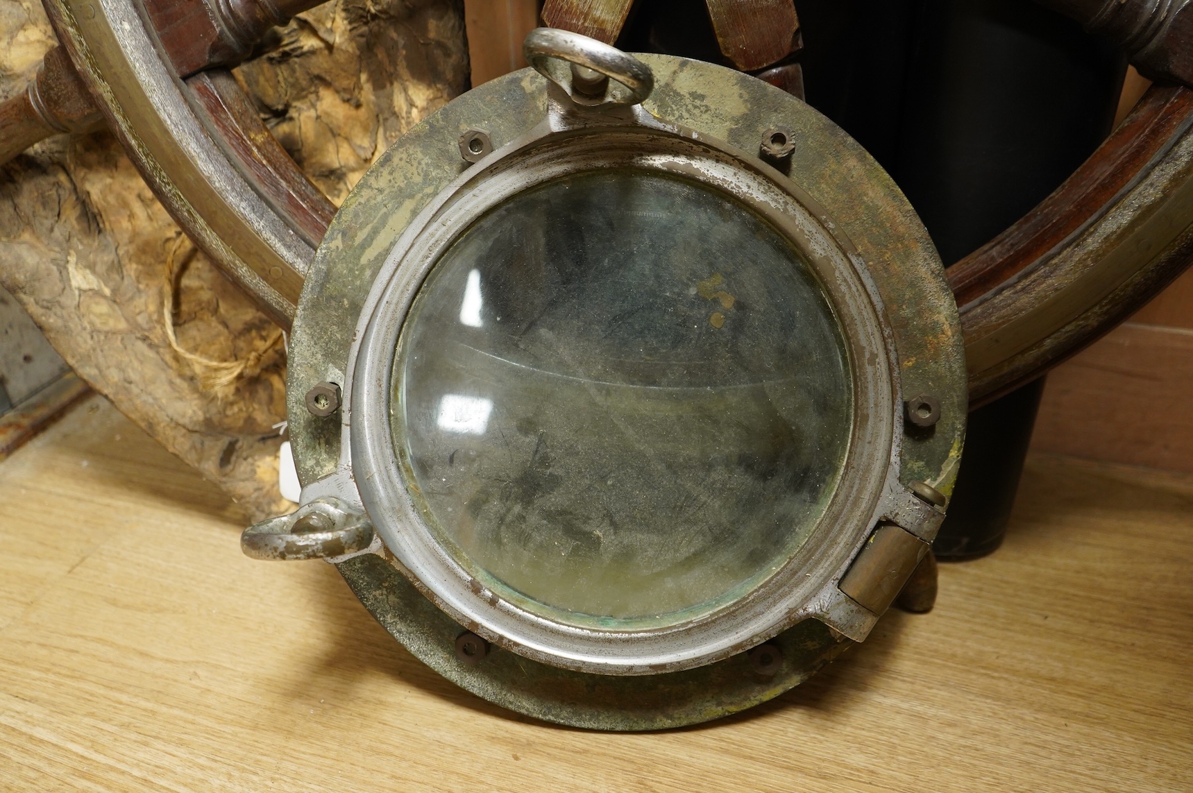 Lot 1628 , A mahogany ships wheel, diameter 80cm, and a brass and chrome porthole, diameter 39cm, by repute off HMS Uganda