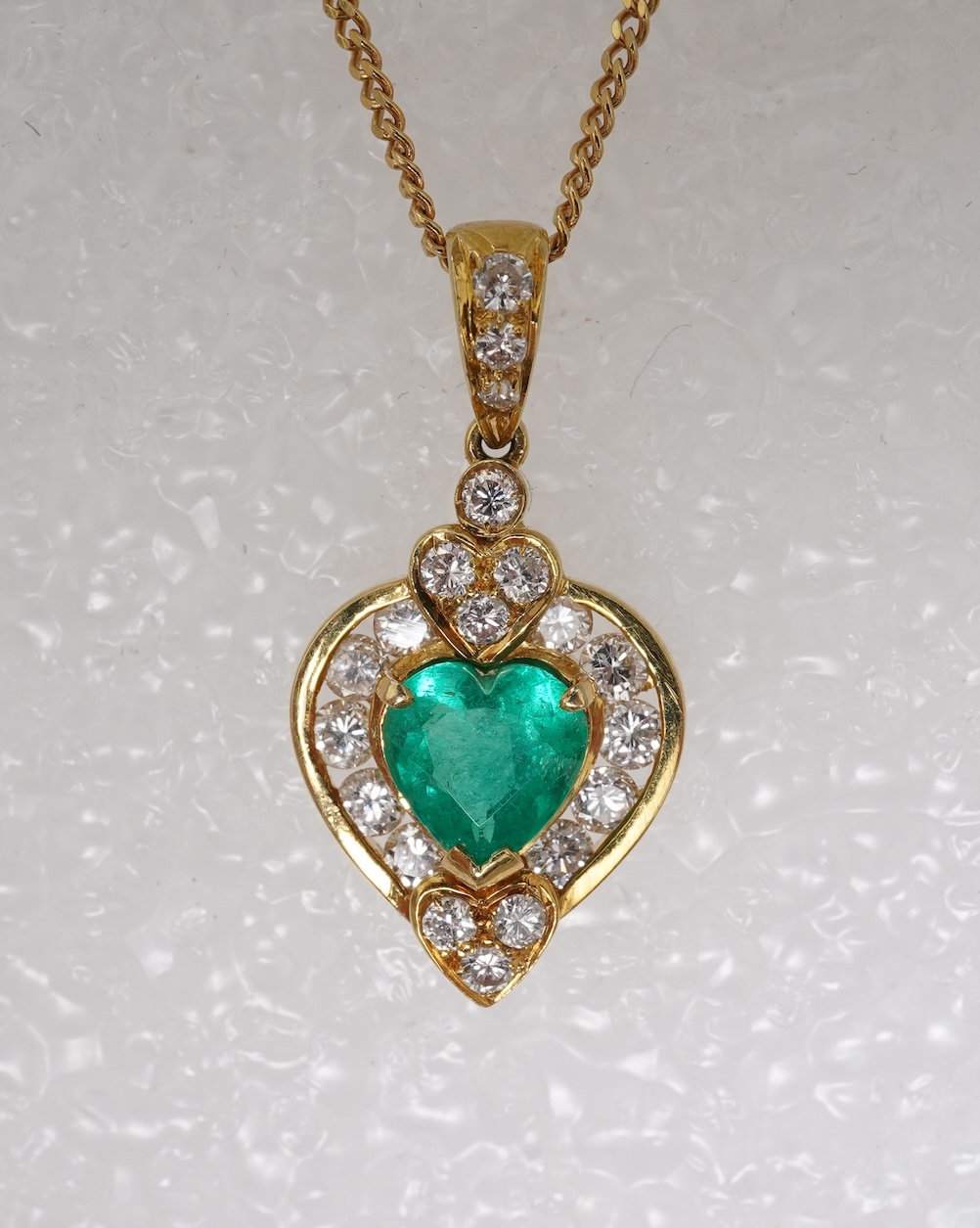 An emerald and diamond pendant, set with a heart-shaped emerald weighing approximately 0.50 carats, within a border set with brilliant-cut diamonds totalling approximately 0.50 carats, to a fine chain necklace, mounted in gold, pendant length 2.4cm stamped 750, chain length 40cm, stamped 585, Italian maker's marks, combined gross weight approximately 5 grams