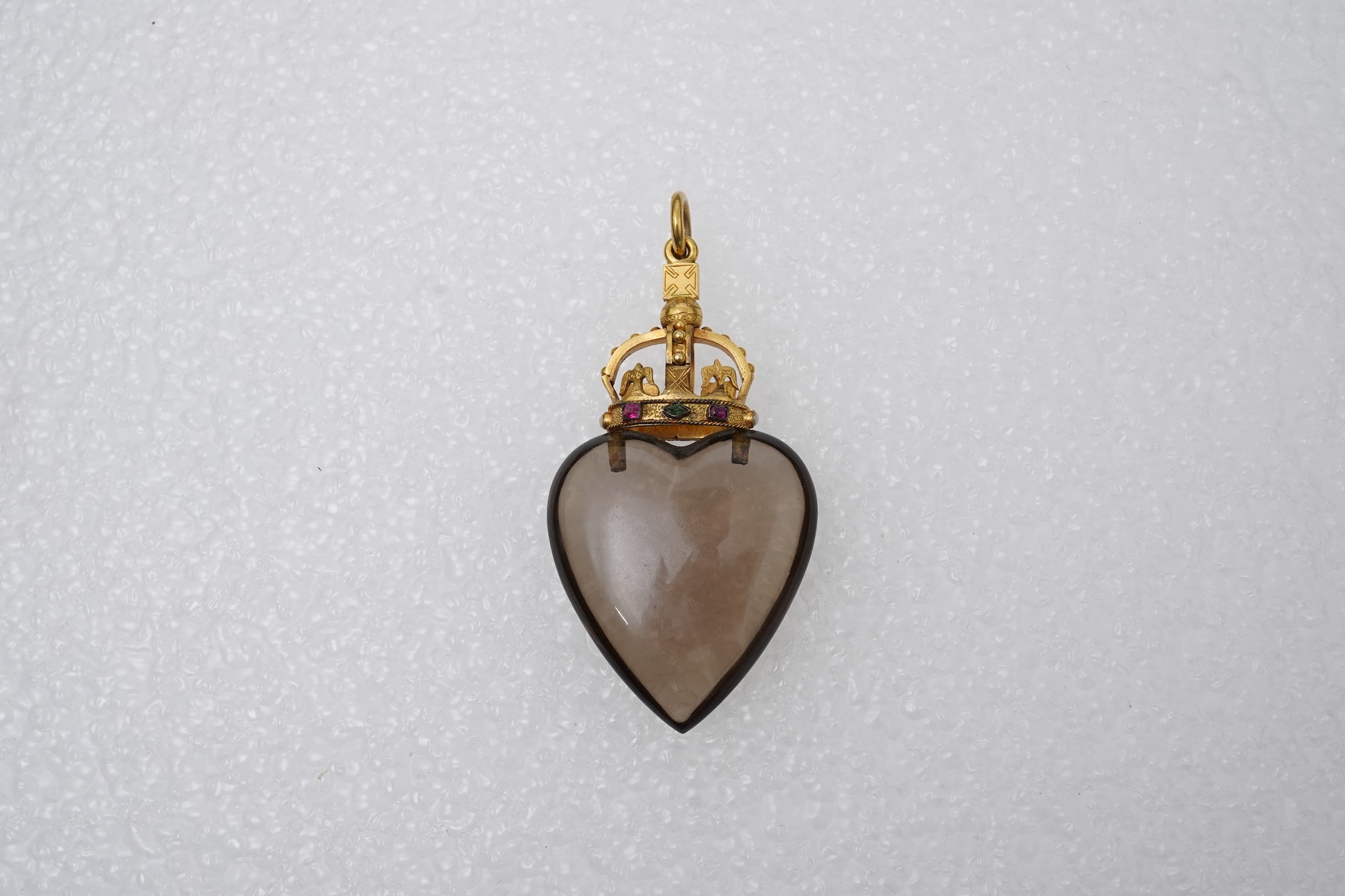 Hamilton and Inches, a smoky quartz and gem-set Luckenbooth pendant, Scotland, late 19th century, composed of a carved smoky quartz heart surmounted by a gold crown set with emeralds, rubies and seed pearls, length 6cm, one ruby deficient, fitted case stamped Hamilton & Inches