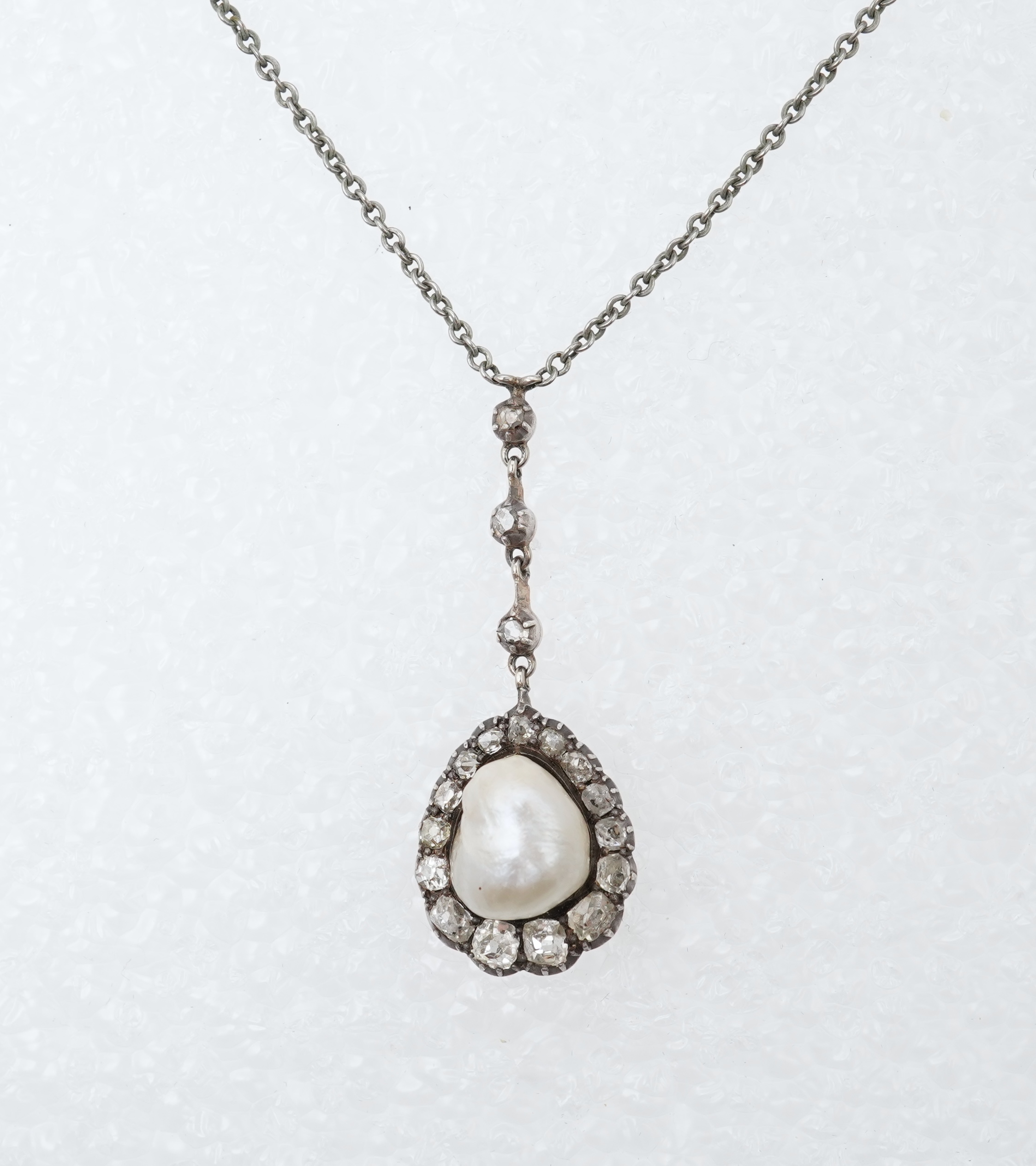 A pearl and diamond pendant, circa 1900, of drop-shaped outline, centring on a pearl measuring approximately 9 x 7.5mm, within a border of cushion-shaped diamonds totalling approximately 0.60 carats, suspended from rose-cut diamond links spaced by sections of knife wire, to a chain necklace, mounted in silver and gold, pendant length 3.5cm, chain length 42cm, clasp set with pastes, pearl untested