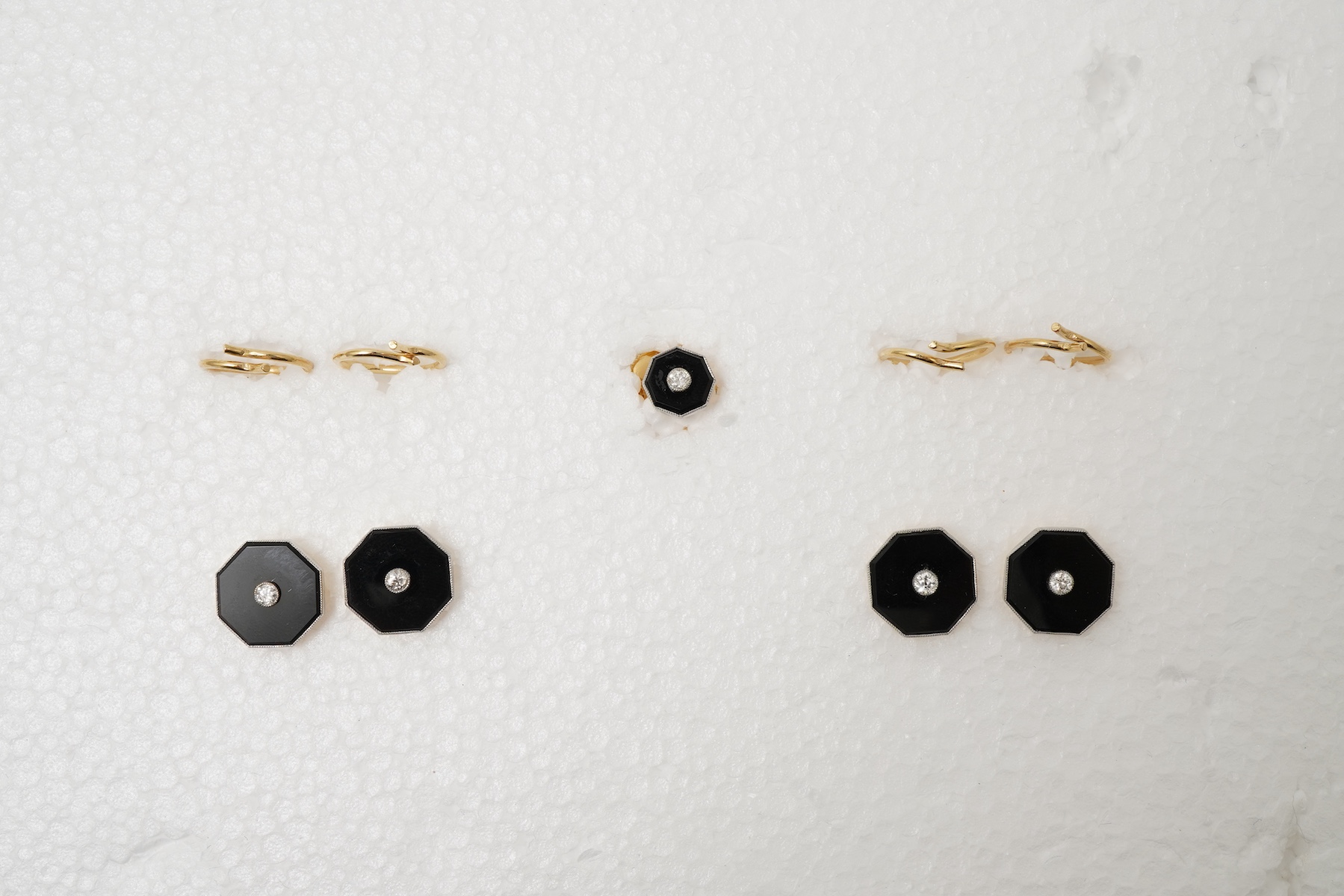 Retailed by Mappin & Webb, an Art Deco onyx and diamond dress set, circa 1920, comprising: four shirt studs and a single collar stud, each of octagonal outline in polished onyx, and centring on a circular-cut diamond, diameters 7-12mm, each stamped 18CT & PT, combined gross weight approximately 6.5 grams, fitted case stamped Mappin & Webb