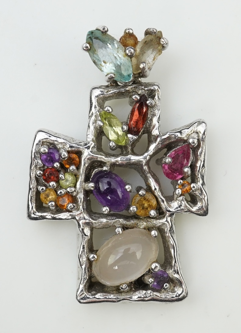Christian LaCroix, a gem-set pendant, designed as a cross in textured silver, set with variously cut gemstones including chalcedony, amethyst, blue topaz and citrine, length 3.5cm, British hallmarks, maker's mark for Christian LaCroix