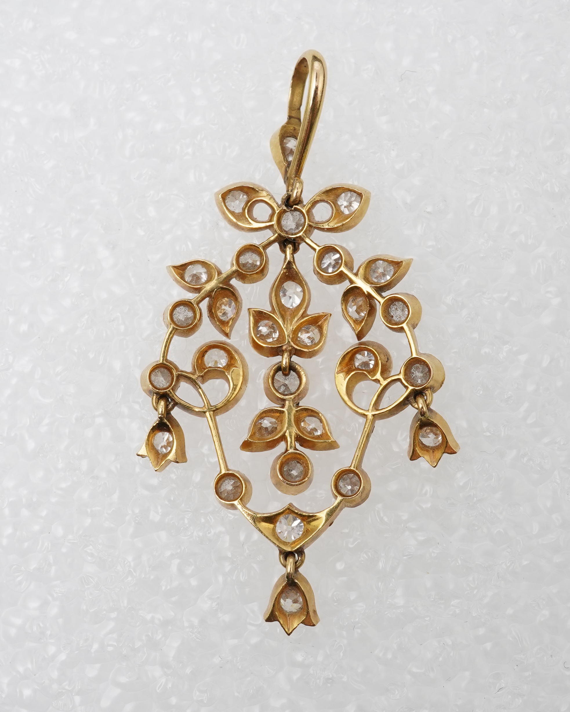 A diamond pendant, early 20th century, of foliate scroll design, set with circular-cut diamonds totalling approximately 3.00 carats, mounted in gold, length 5.3cm, gross weight approximately 8.5 grams