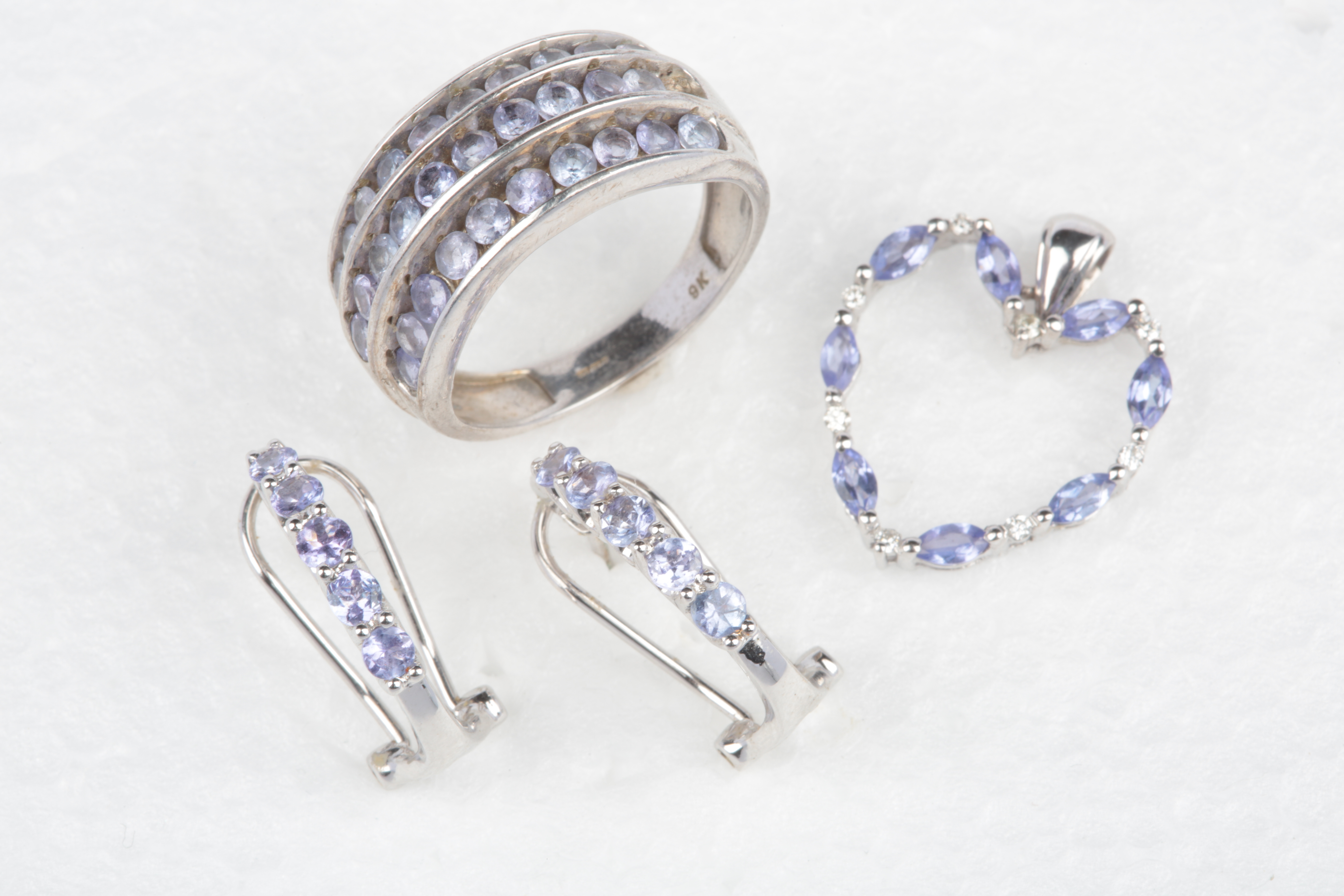 A collection of tanzanite jewels, comprising: a pair of half hoop earrings set with circular-cut tanzanites in white gold, length 1.8cm each, stamped 18K, combined gross weight approximately 5 grams; a heart-shaped pendant set with marquise-shaped tanzanites and brilliant-cut diamonds in 18ct gold, length 2.1cm, British hallmarks, gross weight approximately 1.5 grams; and a half-hoop ring channel-set with three rows of circular-cut tanzanites, in 9ct white gold, size N1/2, British hallmarks, gross weight approximately 4.9 grams, one tanzanite deficient