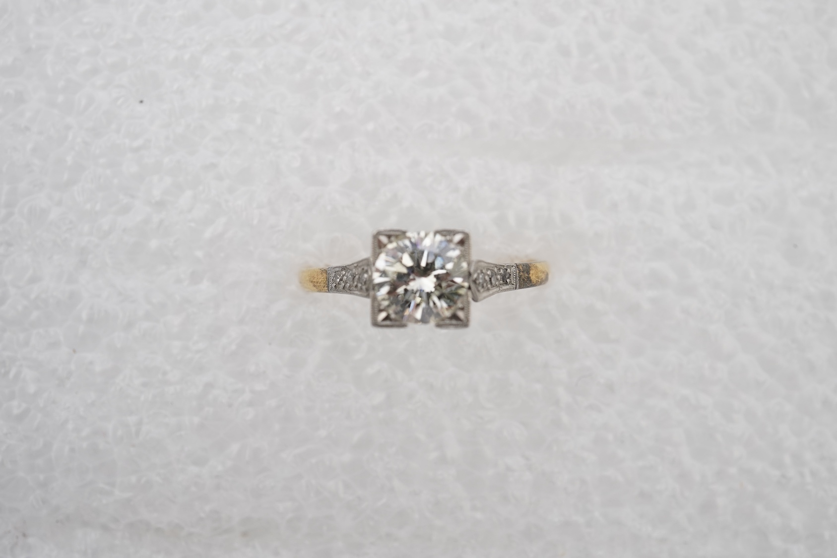 A diamond ring, set with a brilliant-cut diamond weighing approximately 0.85 carats, in a square setting, to single cut diamond shoulders, mounted in gold and platinum, size Q, stamped 18CT PLAT