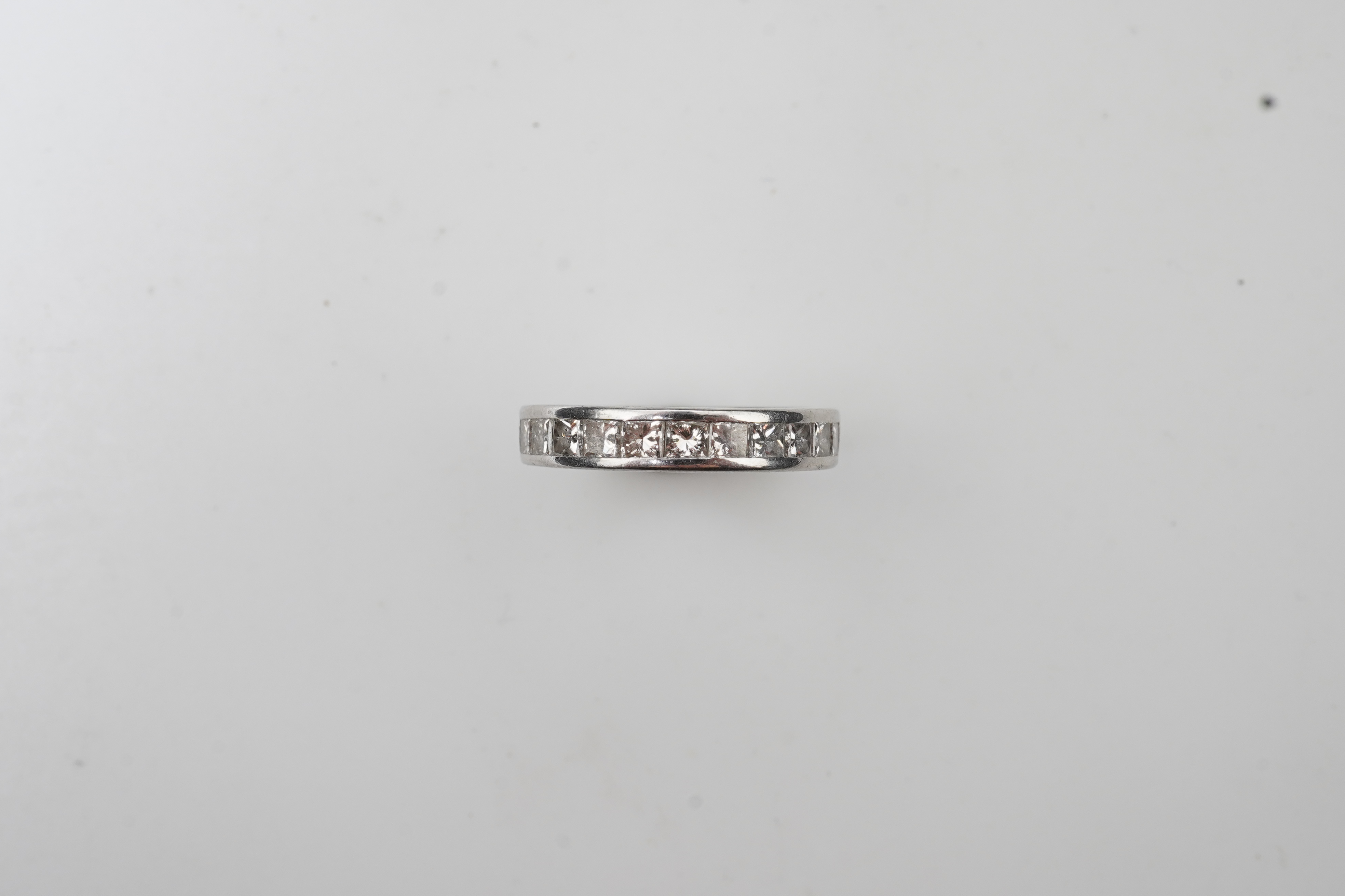 A diamond eternity ring, circa 2000, designed as a continuous band of princess-cut diamonds totalling approximately 2.40 carats, mounted in platinum, size J1/2, British hallmarks