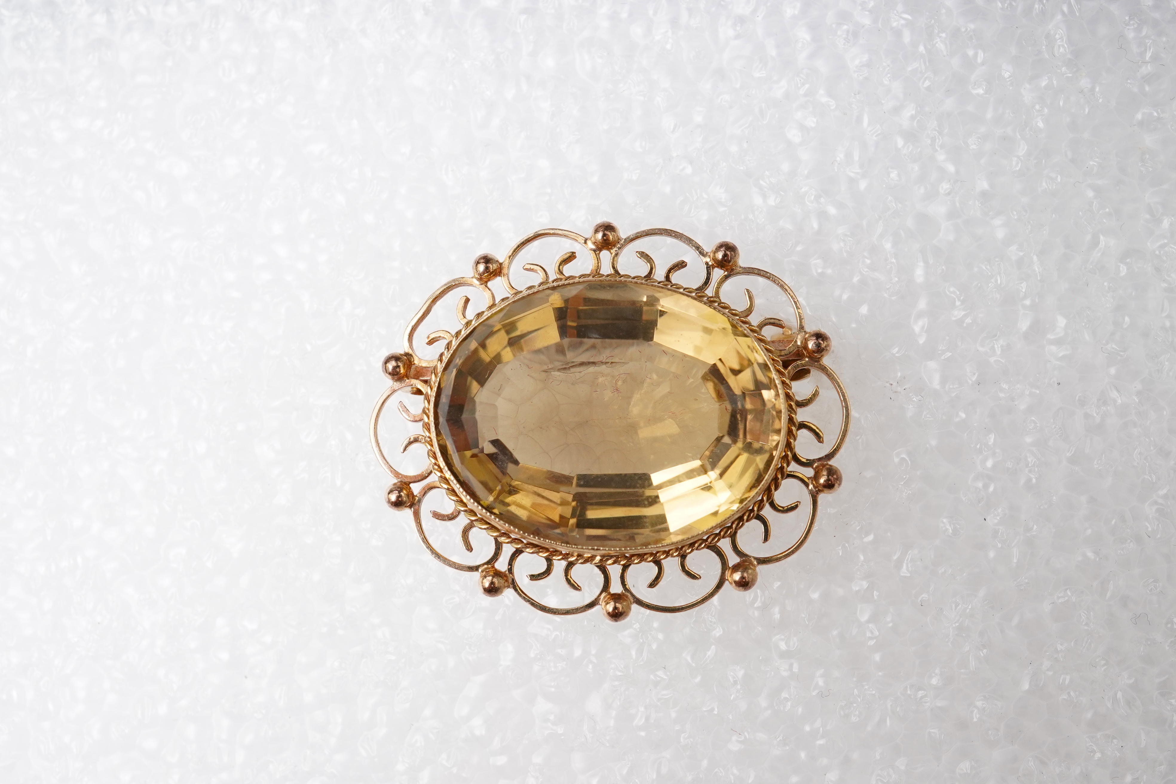 Lot 2917 , A 9ct gold and citrine brooch, set with an oval citrine within an openwork border, length 3.7cm, British hallmarks, gross weight approximately 13 grams