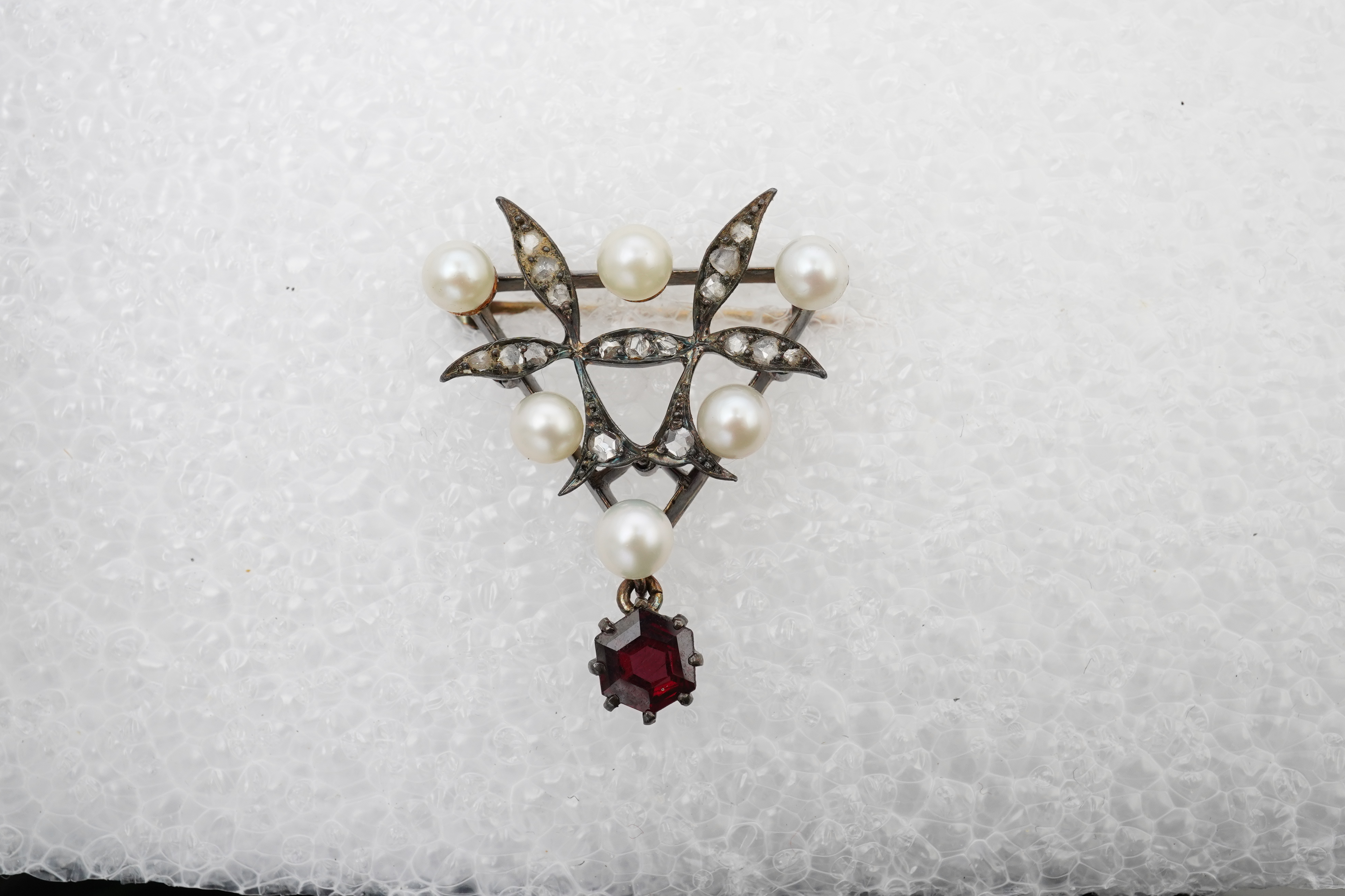 A pearl, garnet and diamond brooch, of foliate design, set with rose-cut diamonds and pearls, suspending a hexagonal step-cut garnet drop, mounted in silver and gold, length 3.3cm, pearls untested
