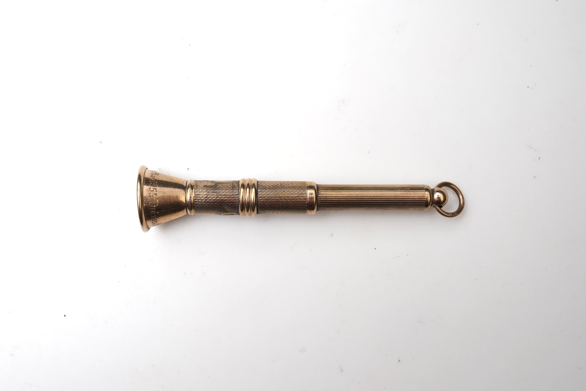 A 9ct gold cigar piercer, mid 20th century, of flared design, the piercer operated by pushing the top down, inscribed 'Maccabi Iodack Solomons May 1955 Dublin', length 7.4cm, British hallmarks, gross weight approximately 8.5 grams